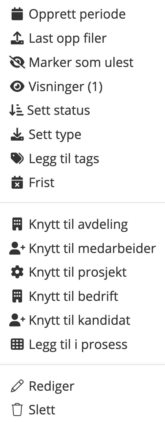 - Status – Disse statusene definerer man selv, slik at man kan velge statuskategori basert på arbeidsflyten internt i bedriften (hvis man har rettigheten til dette).