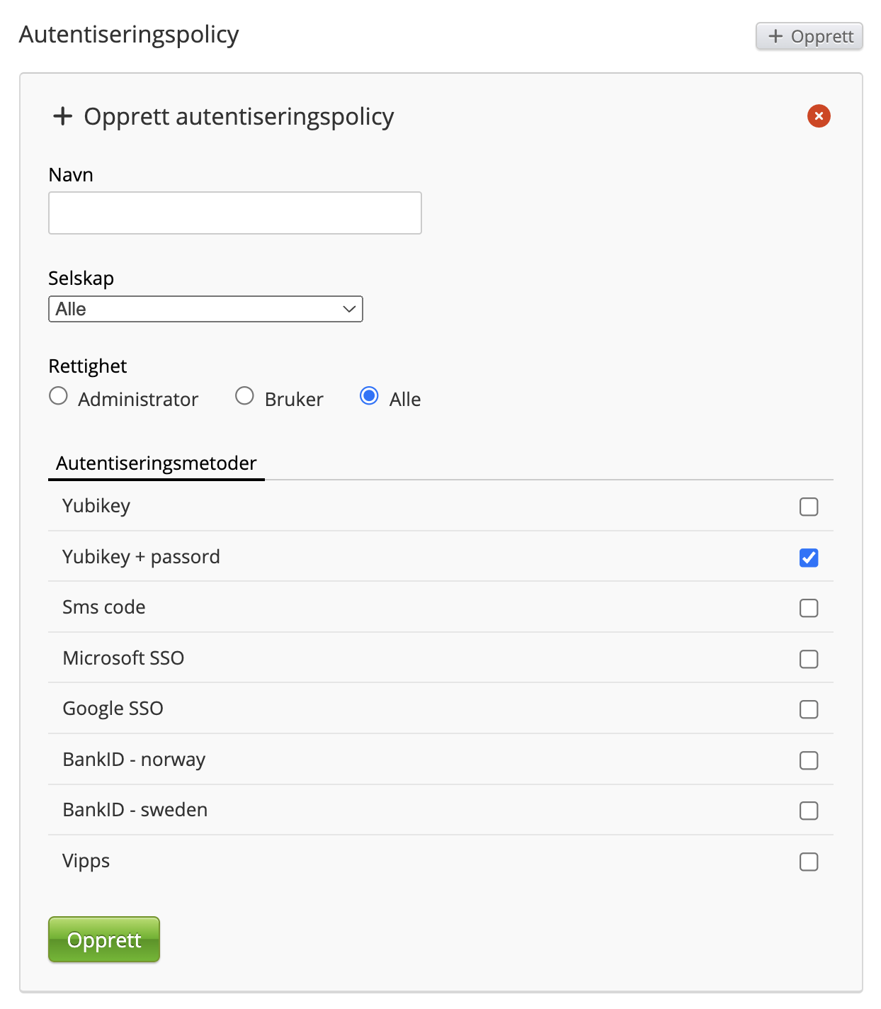 Her har man mulighet til å sette opp autentiseringspolicyer for spesifikke systembrukere. Dersom en bruker er relevant for en av disse policyene vil brukeren bli bedt om å sette opp den eller de påkrevde autentiseringsmetodene første gang vedkommende logger seg inn. For mer informasjon, se MFA og SSO.