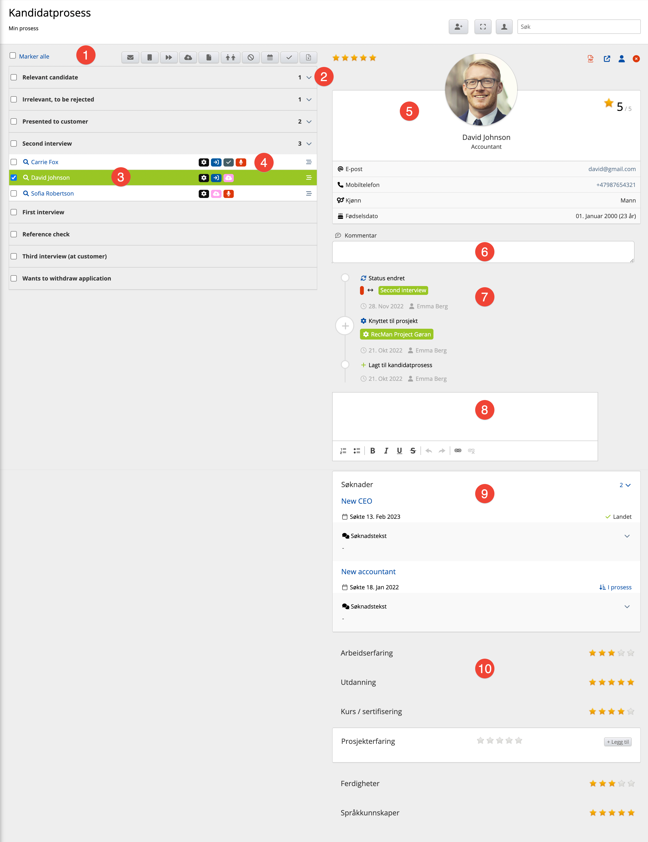 I bildet over ser vi hvordan siden til Kandidatprosess ser ut. Følg de nummererte stegene i bildet for å lære om de forskjellige feltene: