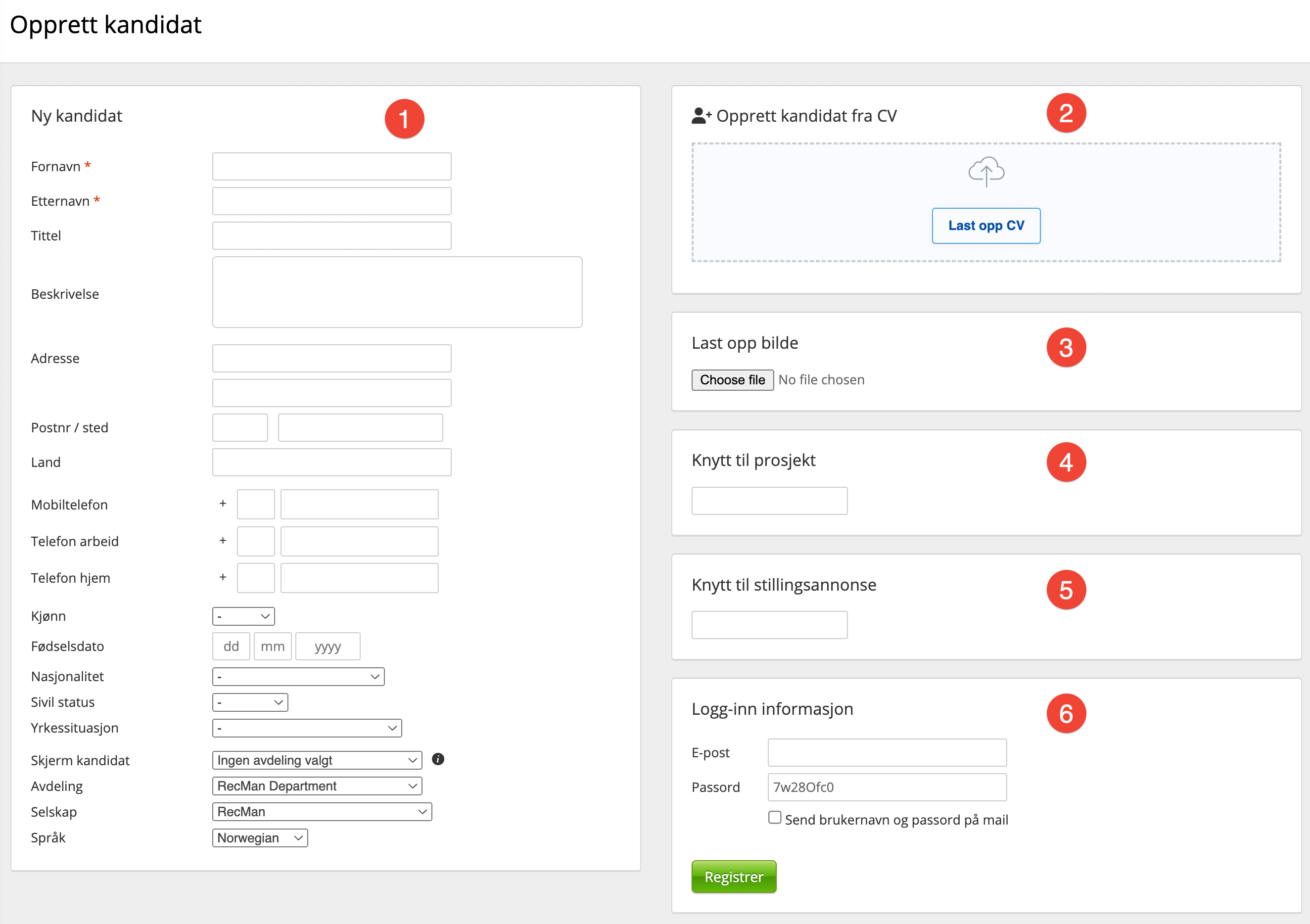 - Kandidat-informasjon: Generell informasjon om kandidaten. Merk at du må fylle ut de obligatoriske feltene som er markert med en rød stjerne for å opprette en kandidat.