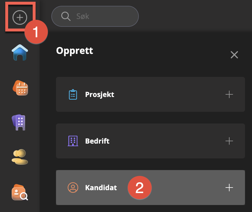 Kandidater blir vanligvis introdusert til systemet ditt når de søker på en stillingsannonse, eller registrerer profilen sin på selskapets subdomene hos RecMan (page.recman). Men for kandidater som f.eks. har sendt søknaden sin via e-post, så kan du også opprette dem internt. For å gjøre dette, naviger til + i sidemenyen og klikk på Kandidat for å opprette: