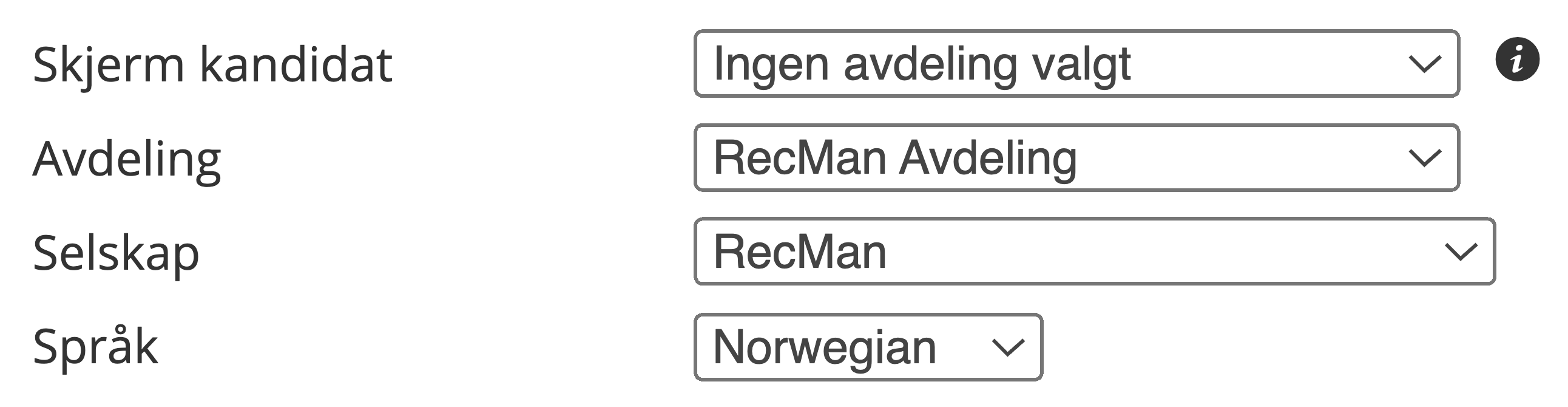 Når du oppretter en kandidat, kan du også velge deres tilknytning til et selskap og en avdeling. Siden hvert selskap i et system kan ha sin egen RecMan-page, er dette viktig å huske på når kandidaten skal logge inn på profilen sin.