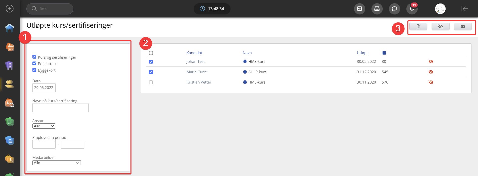 - Ved å huke av boksen ved siden av kandidatens navn, dukker det opp to bokser øverst til høyre på siden. Boksen til venstre (øyet) lar deg skjule alle de avhukede kandidatene. Ved å klikke på Brevet, kan du sende en epost til de kandidatene du har huket av. Dette blir ofte gjort for å minne kandidatene på at de må fornye sitt kurs eller sertifisering. Med excel-ikonet kan du skrive ut en rapport over de utgåtte sertifiseringene/kursene.