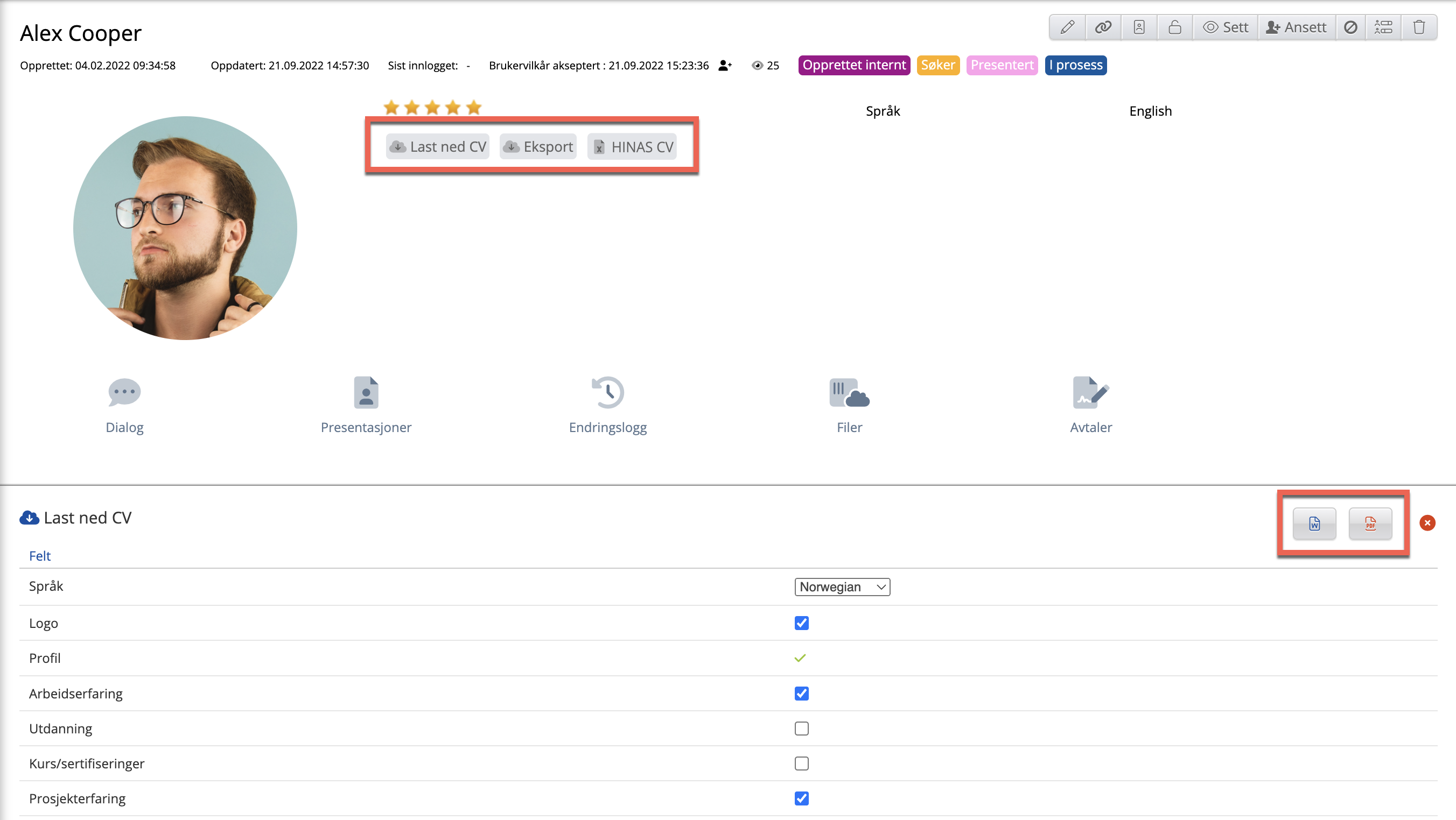 HINAS CV vil hente ut informasjonen og legge den i et dokument normalt brukt innenfor helsesektoren. Last ned CV vil ta ut kandidatens profil til en PDF, mens Eksport vil ta ut kandidatens profil i en JSON fil. Når du trykker på en av disse, vil du få opp følgende alternativer: