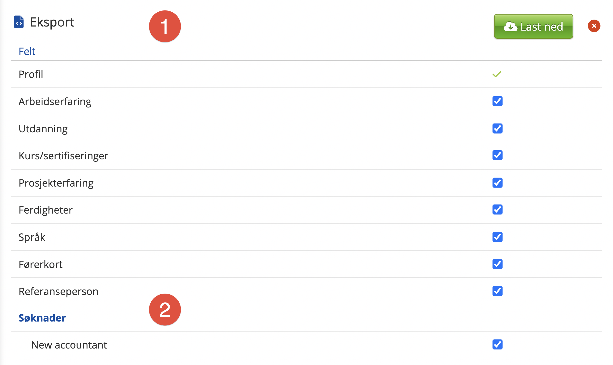 - Dette er felter som er å finne på kandidatkortet. Fjern de du ikke ønsker å ha med på din eksport. Merk at Referanseperson (her markert i blått) kun er tilgjengelig for JSON eksport.