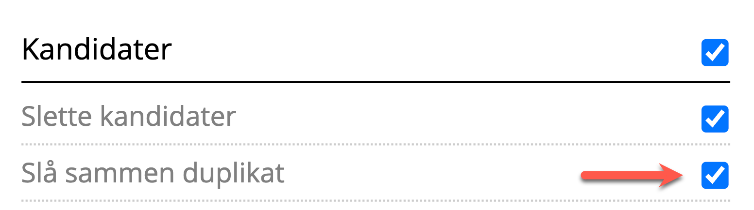 Sammenslåing av duplikater kan skrus på via Systeminnstillinger → Medarbeidere → Finn medarbeiderdet gjelder. Under kategorien Kandidater, vil du finne følgene rettighet som må være skrudd på: