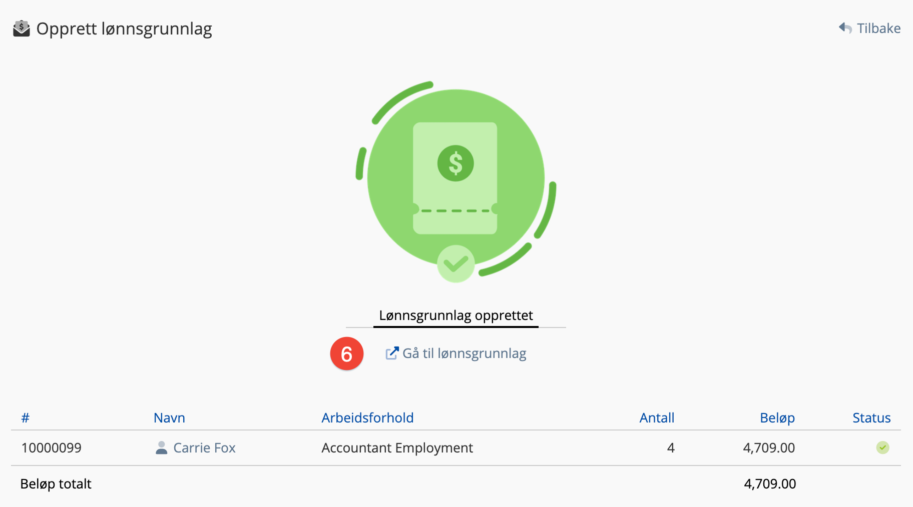- Når du huker av en eller flere av boksene til venstre for navnet til en ansatt, får du muligheten til å opprette lønnsgrunnlag. Etter å trykke på Opprett lønnsgrunnlag knappen, vil du motta en kvittering som viser til lønnsgrunnlaget.