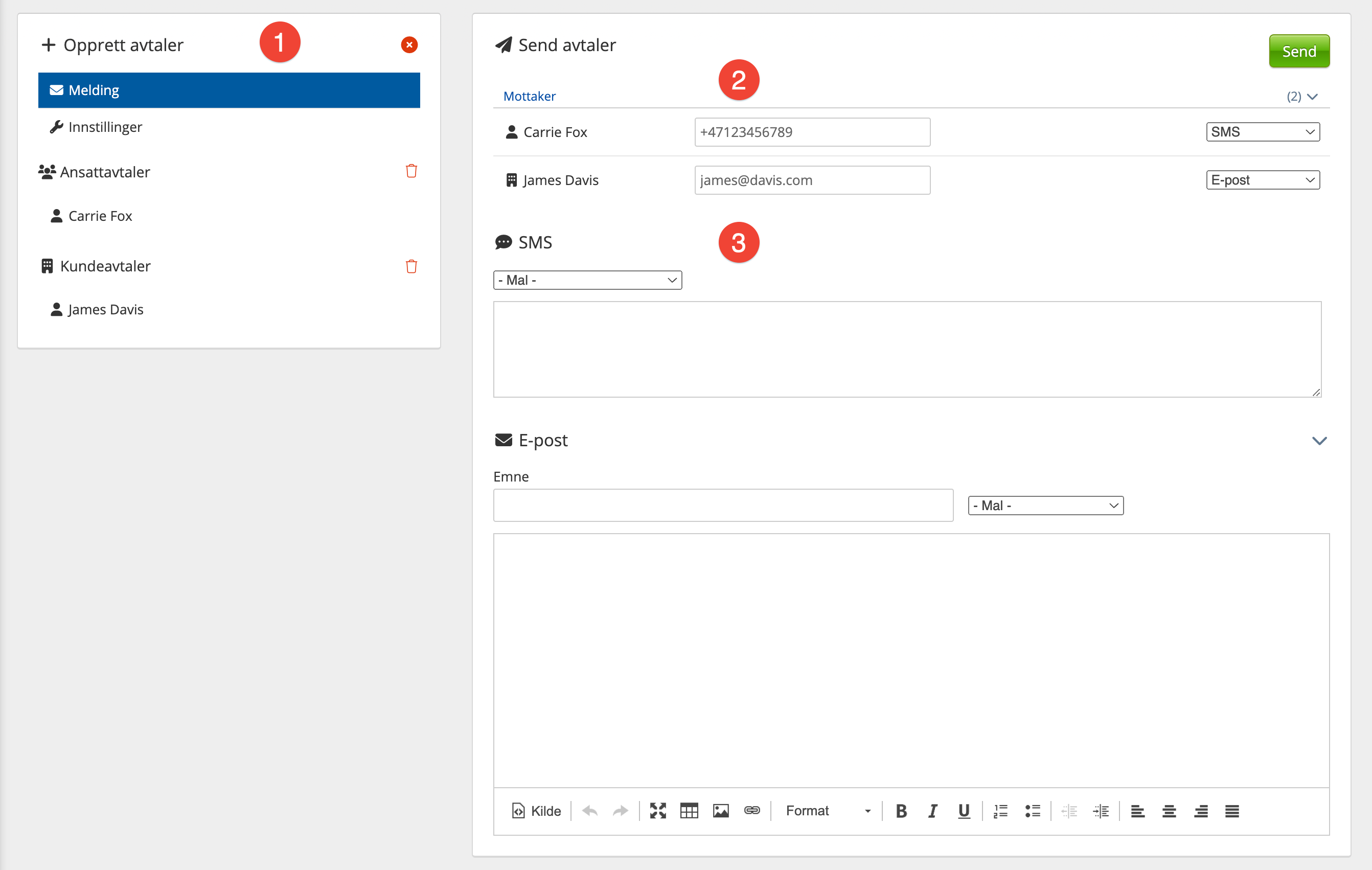 - I dette feltet definerer vi selve utsending metoden, og mailen/meldingen som skal følge med avtalen. Du kan definere om det skal mottas på SMS eller mail, og du kan hente inn maler. Når alt er som det skal, trykker du på Send for å sende vaktbekreftelsen.