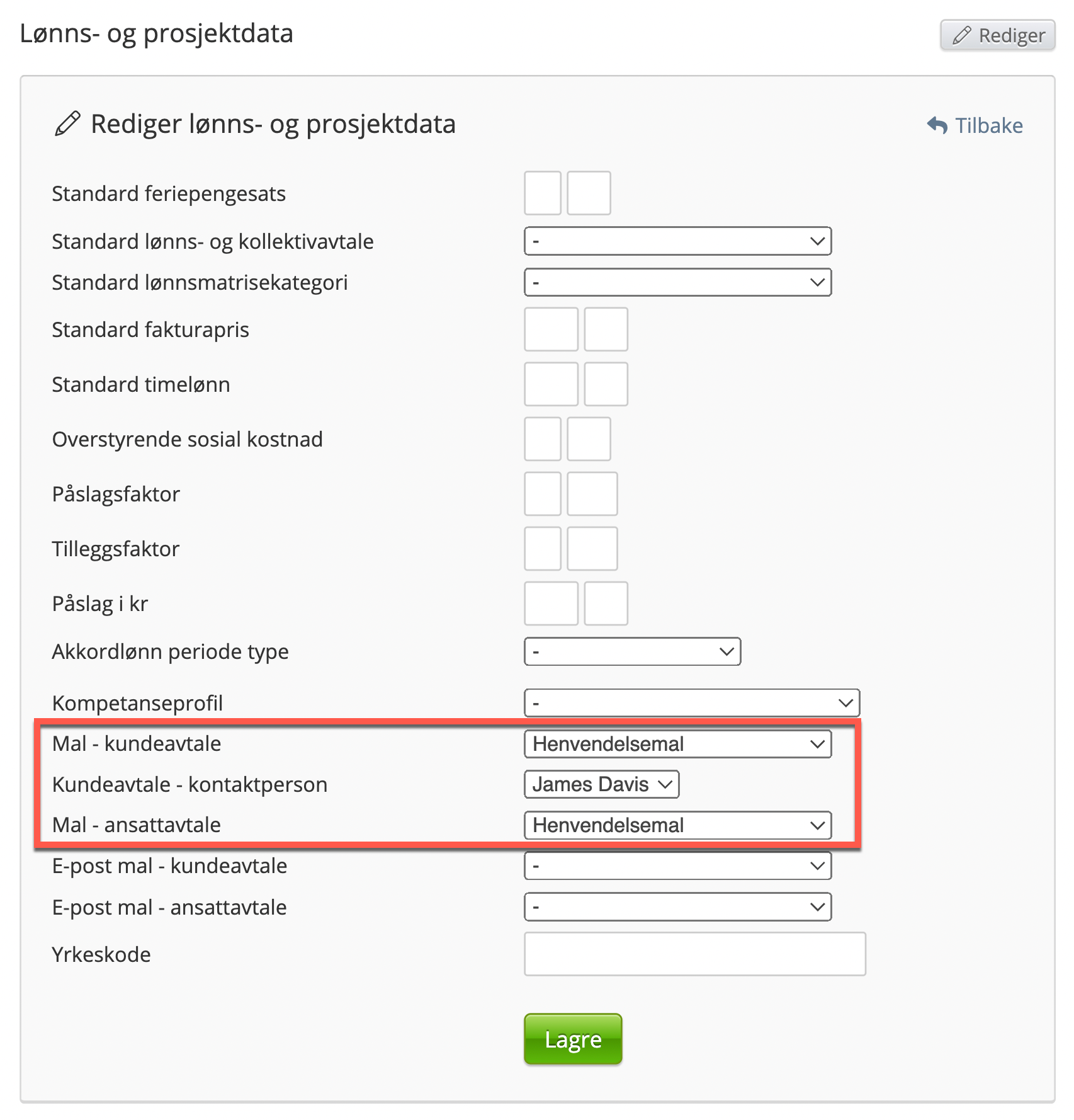 Fra prosjektet har vi også mulighet til å definere hvilke maler som skal brukes, men i tillegg kan vi velge hvilken kontaktperson som skal være standard. Denne kontakpersonen vil da bli valgt som standard når du oppretter en vaktbekreftelse fra Vaktbekreftelsesoversikten. Du finner disse innstillingene under Lønns- og prosjektsdata på prosjektkortet.