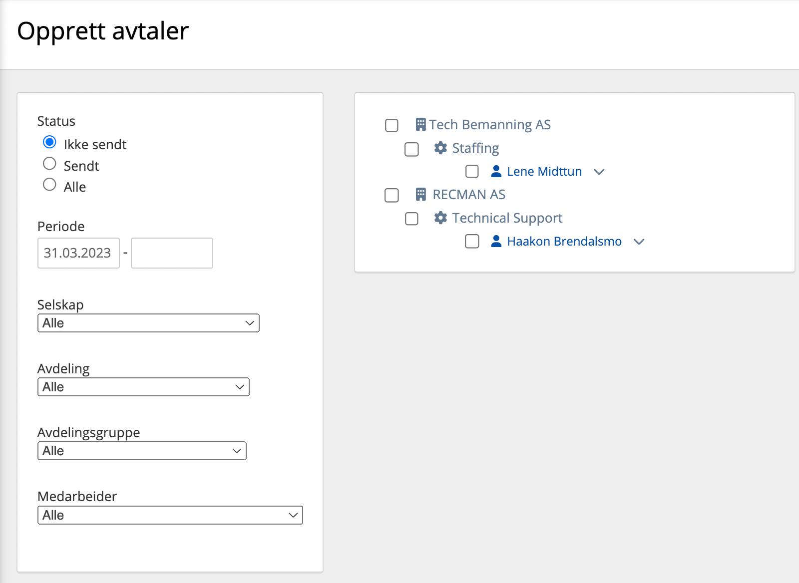 Om det skulle være allerede sendt en avtale enten til kunde eller ansatt, så vil denne ikke bli sendt igjen når du oppretter avtaler fra denne oversikten.
