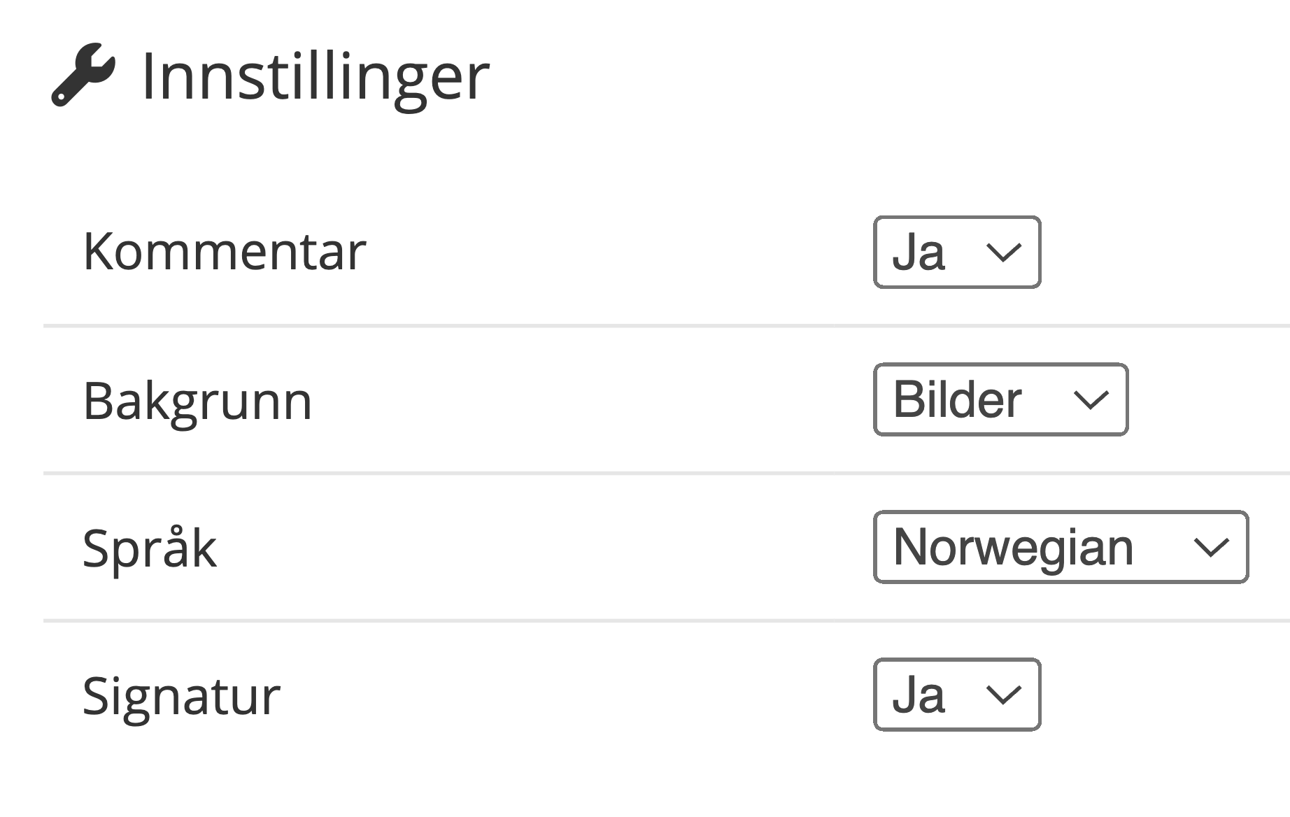 Først går vi igjennom mulighetene du har i systeminnstillingene. For å finne disse innstillingene går du til Systeminnstillinger → Prosjekter → Standardverdier → Ditt selskap. Du får da se dette: