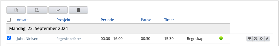 I tillegg vises hvilket prosjekt vakten er tilknyttet, tidsperioden, pause, antallet timer, navn på arbeidsdag , en prikk mer status for timene og knapper med ekstra funksjoner.