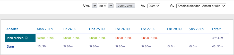 Til høyre under Totalt summeres antall timer en ansatt har på vaktene i en valgt måned.