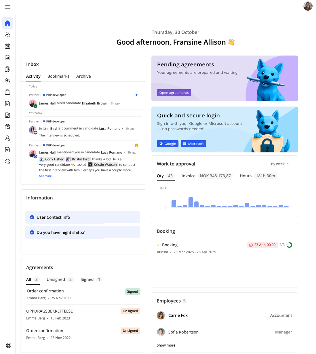 RecMan bedriftsportal er en nettbasert plattform som lar kundene dine logge inn og administrere jobbene sine, mottatte tilbud og fakturaer og mye mer. Noen av funksjonene inkluderer: