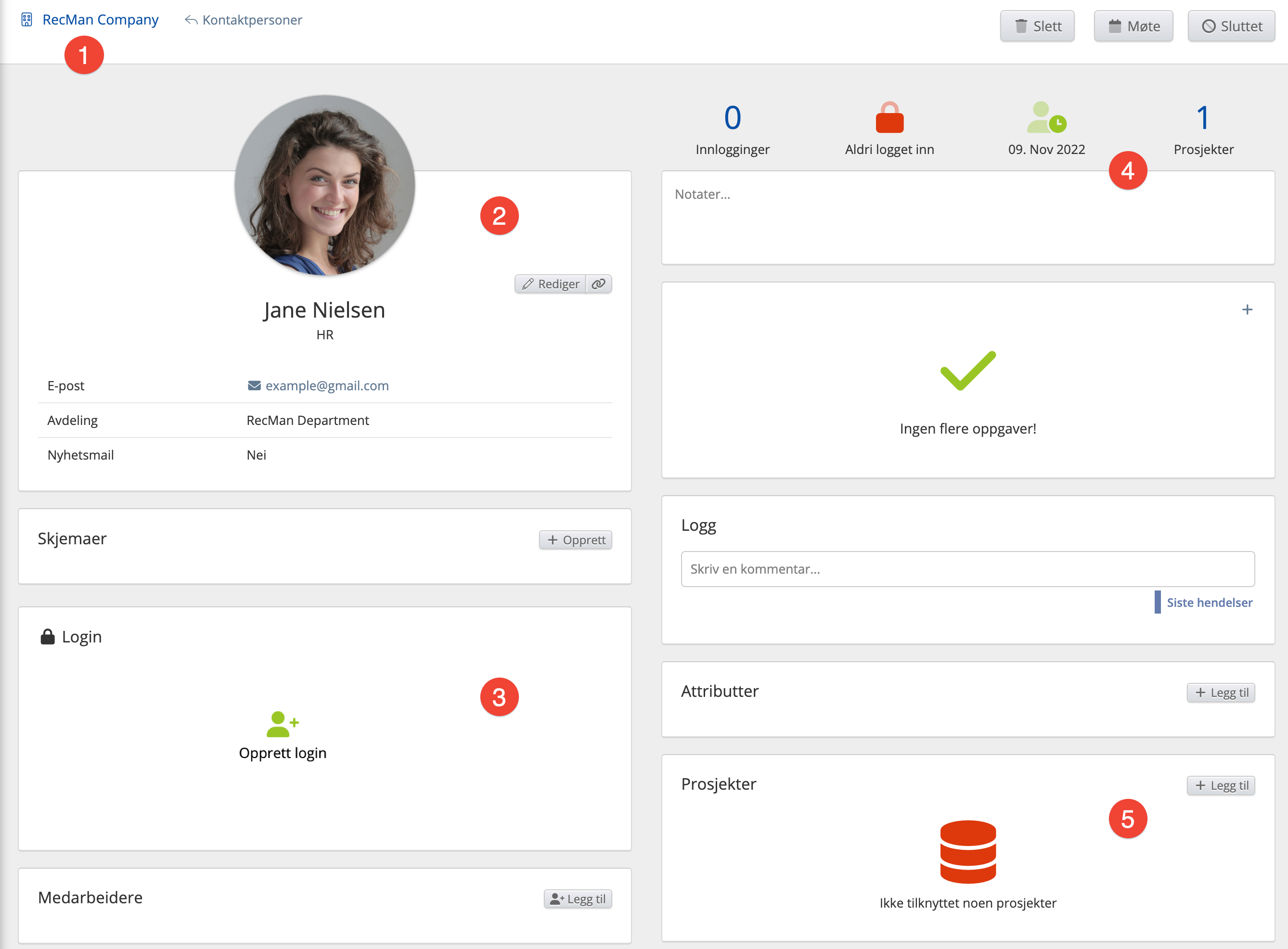 - I dette området finner du basisinformasjon om kontaktpersonen, og du har også mulighet til å endre på den.