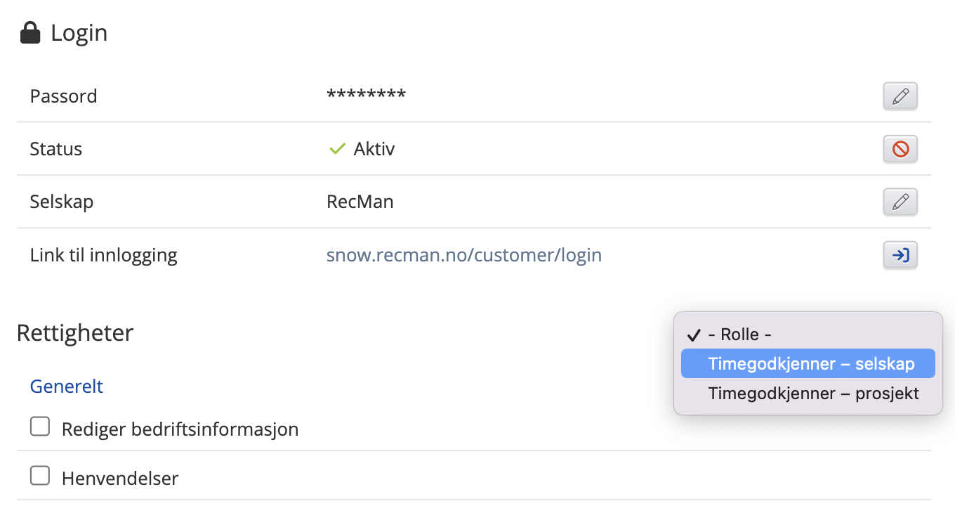 - Rediger bedriftsinformasjon – Gir timegodkjenneren tillatelse til å endre informasjon om de eide selskapene – navn, organisasjon, adresser, fakturatype osv.