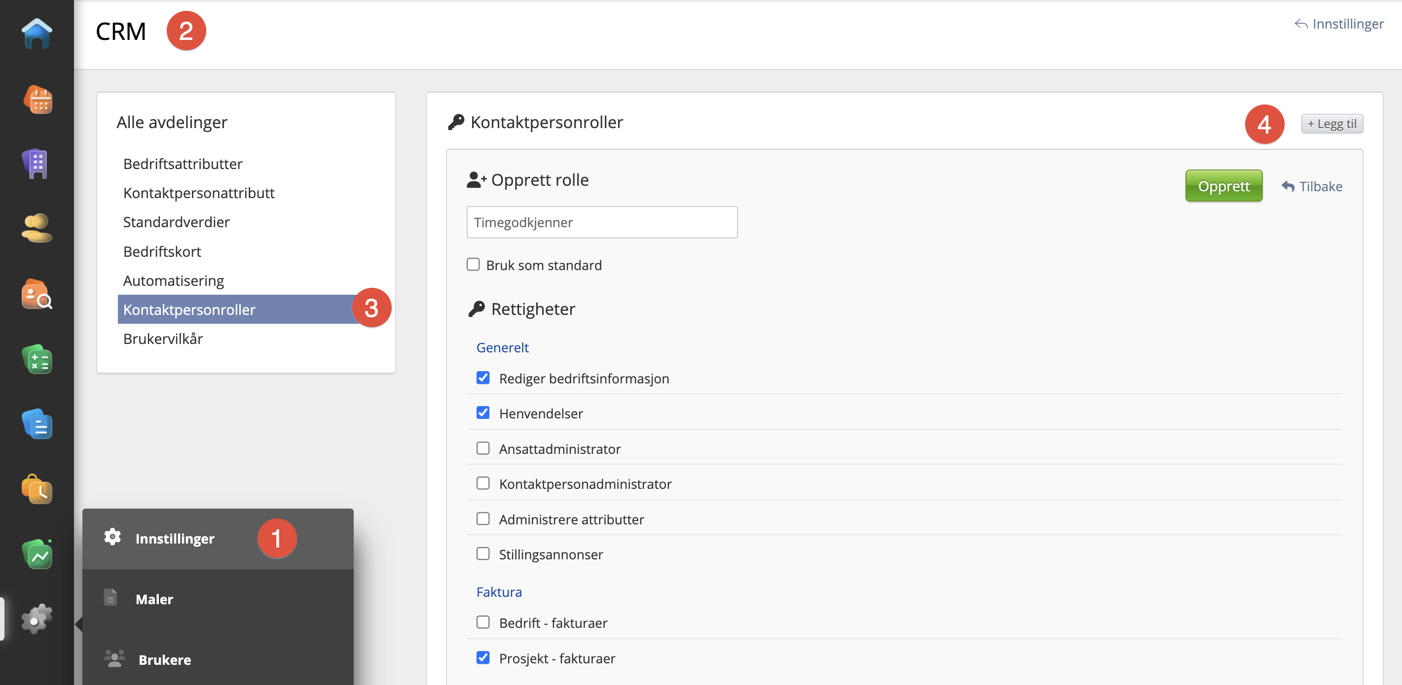 Du kan også definere roller hvis du ønsker. Dette gjør det enklere å tilegne rettigheter raskt på nye timegodkjenneren. For å sette opp nye roller må man være systemadministrator, men de blir tilgjengelige for alle når de er opprettet.