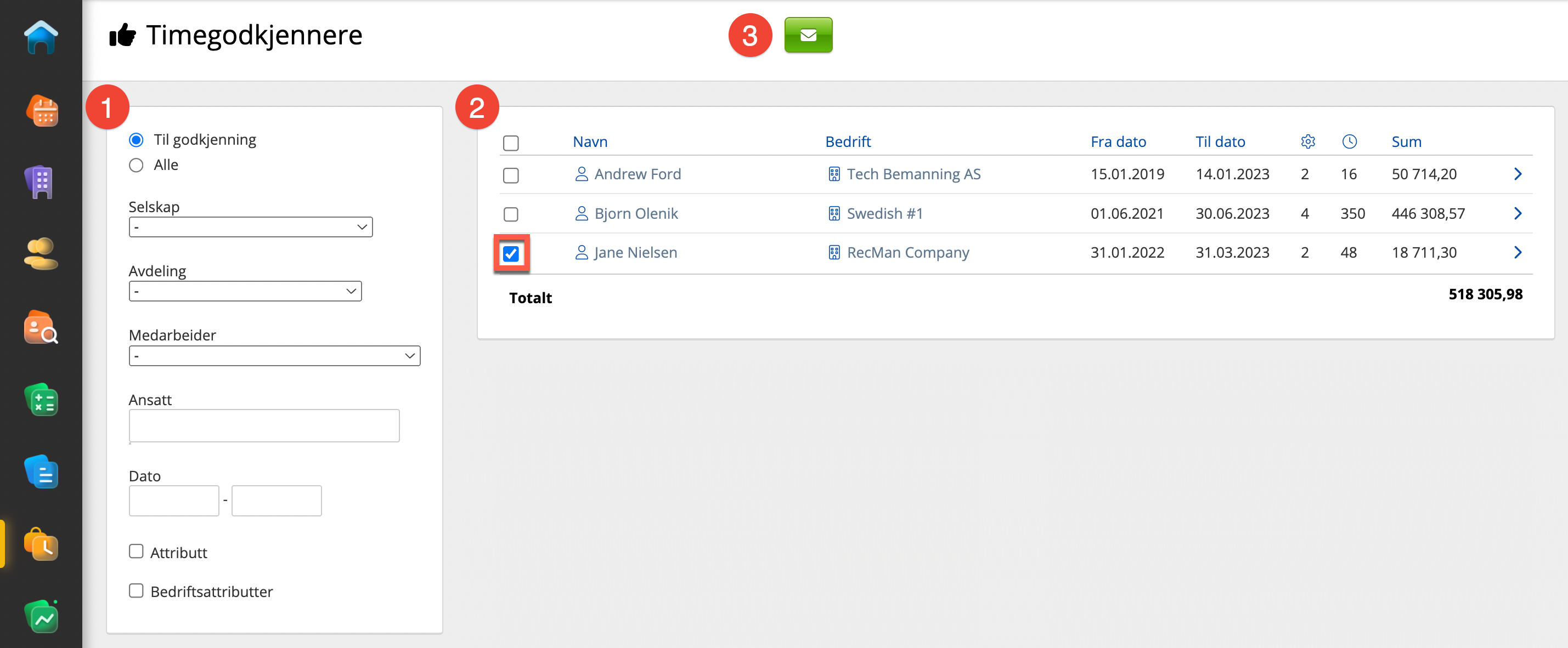 - I dette feltet ser du resultatet av dine søk og filtreringer. Du får en rask oversikt over timegodkjenerne, da ved navn, bedrift, fra/til dato, antall prosjekter de er tilknyttet, antall timer de har til godkjenning samt beløpet de har til godkjenning.