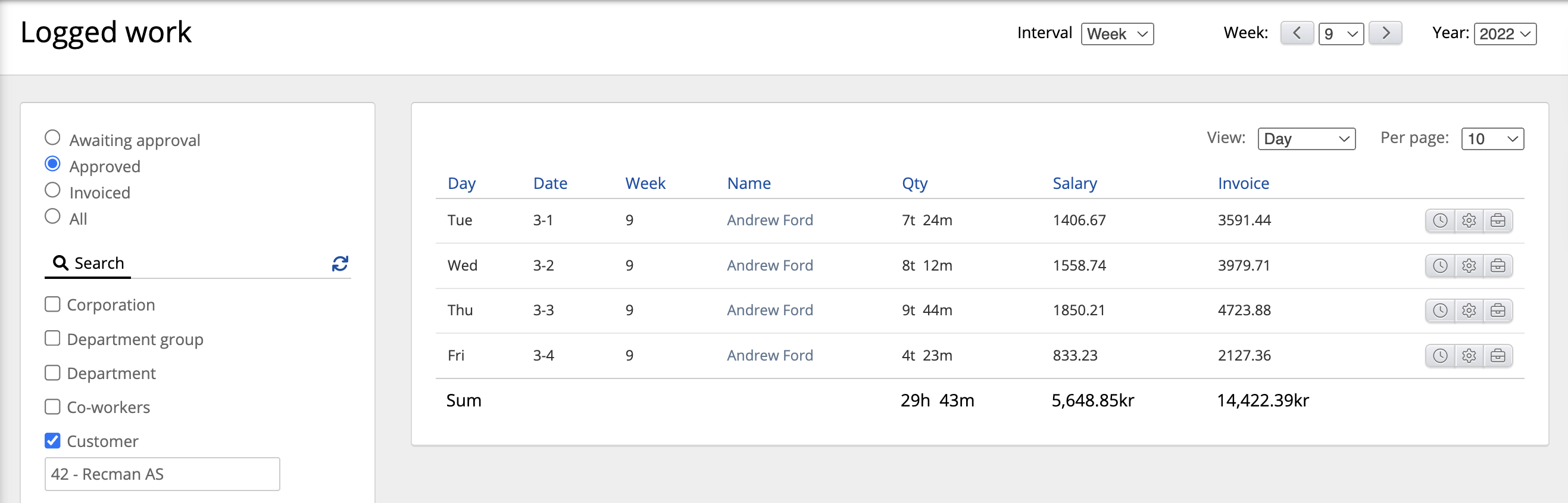 Se alle godkjente timer i uke 9 på en bestemt kunde (42 – Recman AS ), vist sortert og oppsummert på enkeltdager.