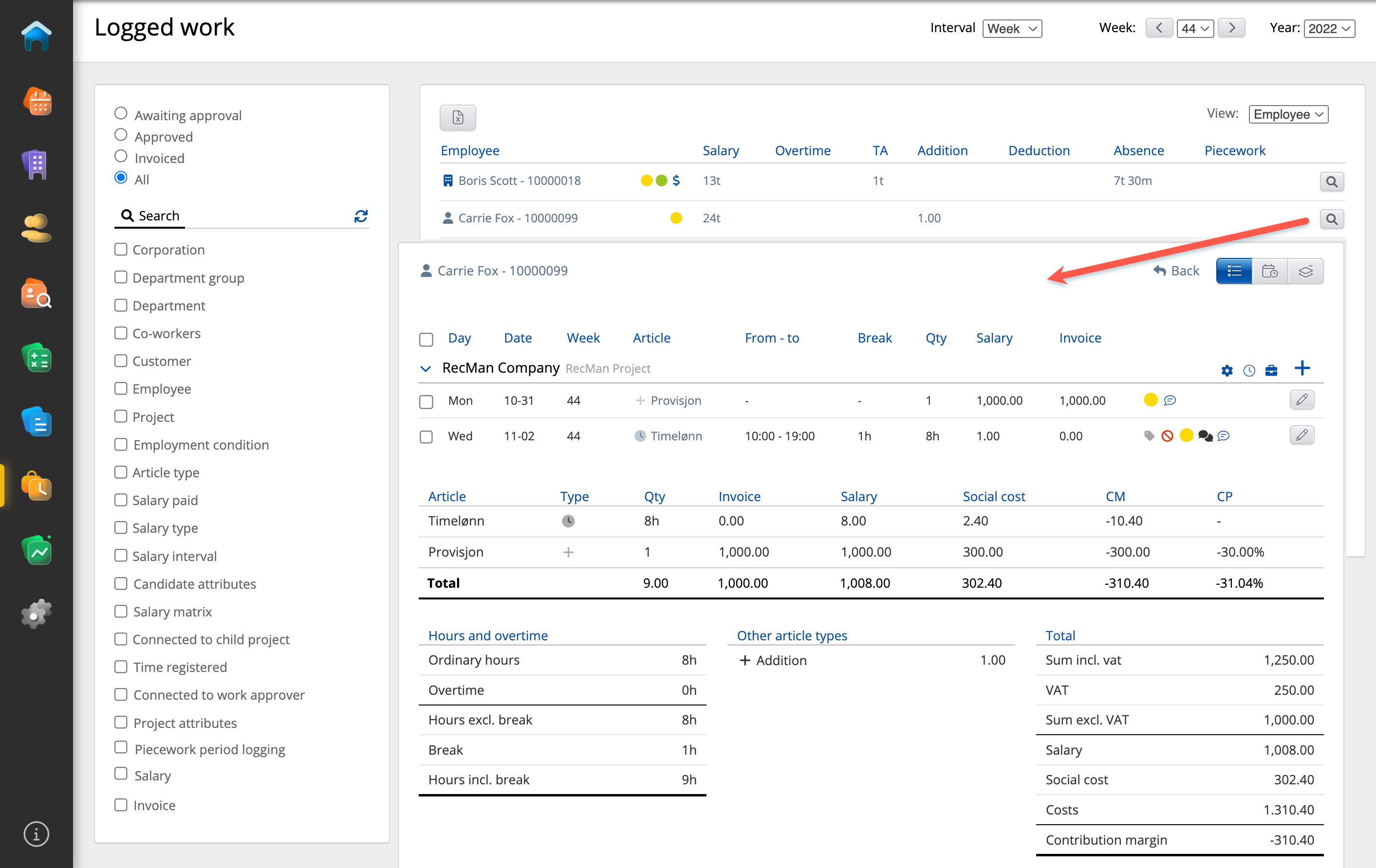 - I den detaljerte oversikten over den ansatte kan du se de enkelte dagene og artiklene som er registrert på dem. Her kan du som nevnt godkjenne arbeid, men du kan også redigere det loggførte arbeidet og for eksempel redigere lønnsopplysningene, logge nytt arbeid, fravær eller overtid m.m.