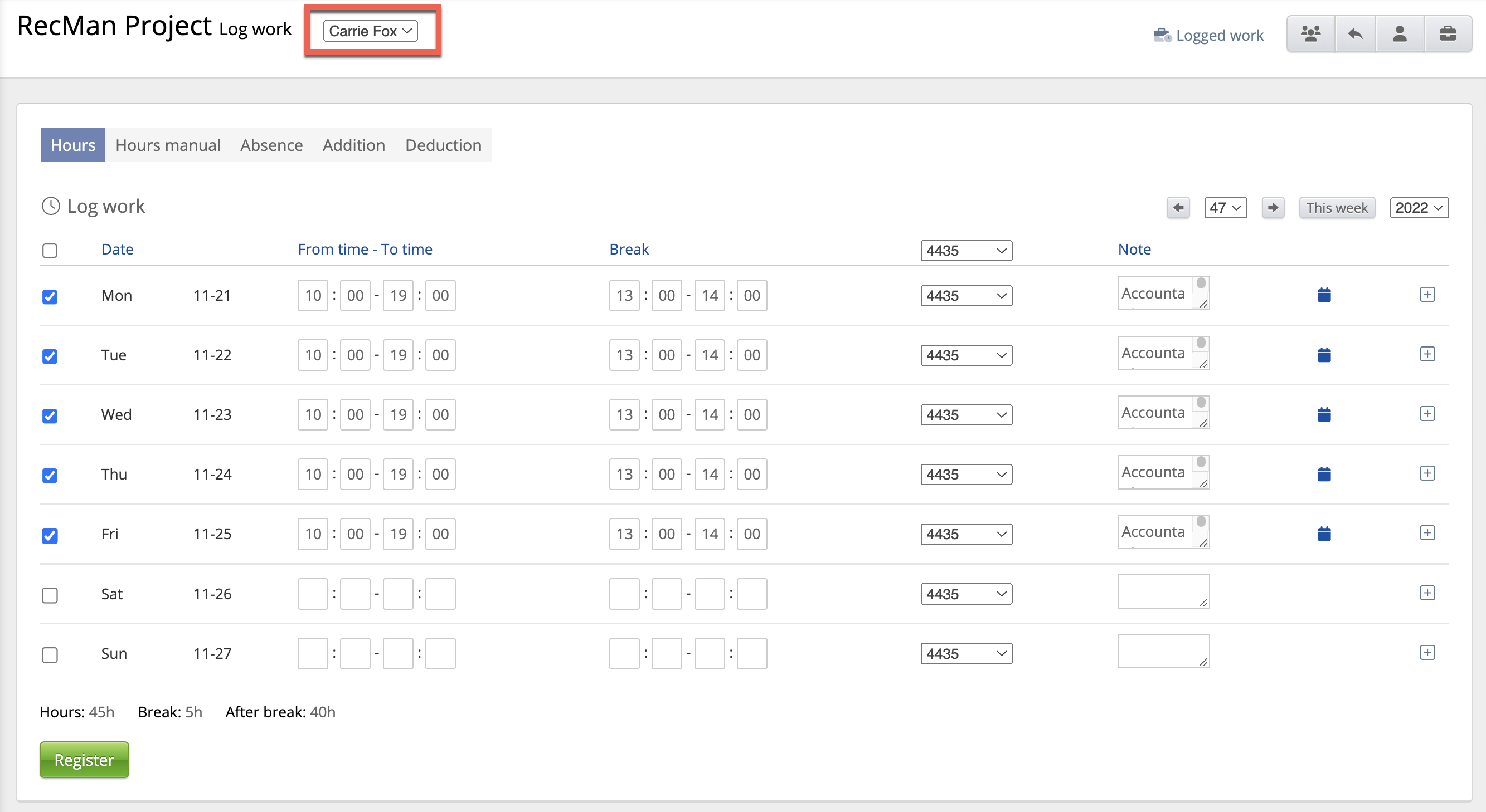 Hvis du hadde flere ansatte i samme prosjekt, ville navnene deres stå oppført på venstre side, slik at du enkelt kan bytte mellom dem for å logge arbeid på flere ansatte. Hvis du trykker Registrer , vil verket bli låst og lagt til den loggede arbeidslisten under dette vinduet.