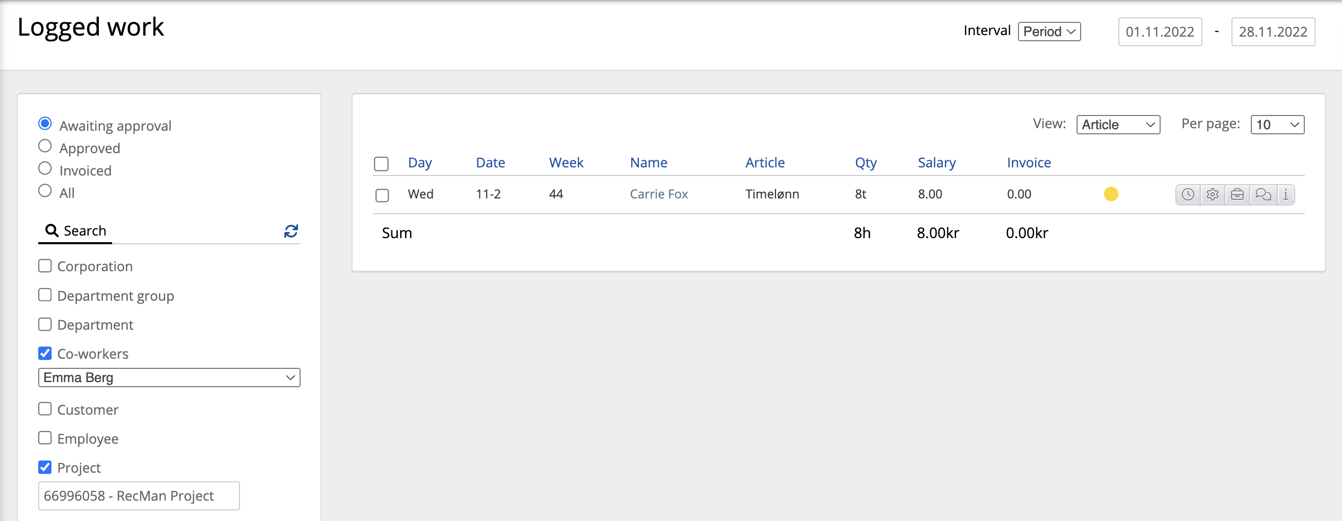 Se alle vikarer som har arbeid til godkjenning på RecMan-prosjektet knyttet til ansvarlig medarbeider (Emma Berg). Vi valgte en bestemt periode. Oversikten er sortert på artikkelen.