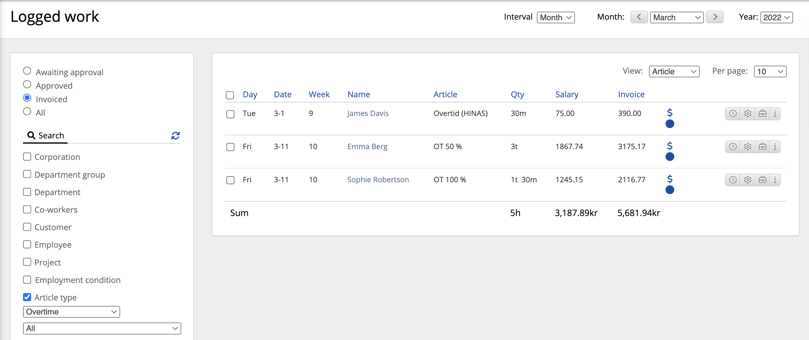 Se all overtid (artikkeltype overtid ) som er loggført i mars måned. Her ønsker vi å se alle de i utvalget som er fakturert. Sortert etter artikkel.