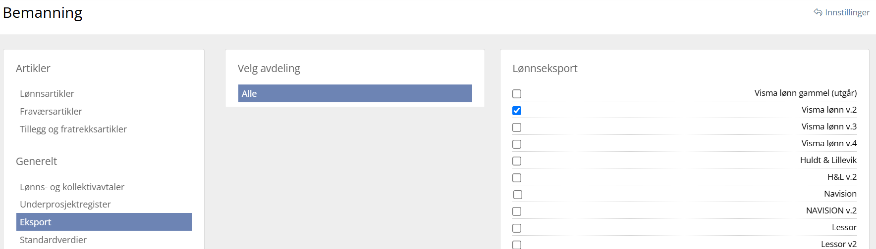 Gå til Systeminnstillinger → Bemanning → Eksport → Velg avdeling = Alle → huk av for Visma lønn v.2. Da vil Visma lønn dukke opp som et alternativ når man skal eksportere lønnsgrunnlag i RecMan.