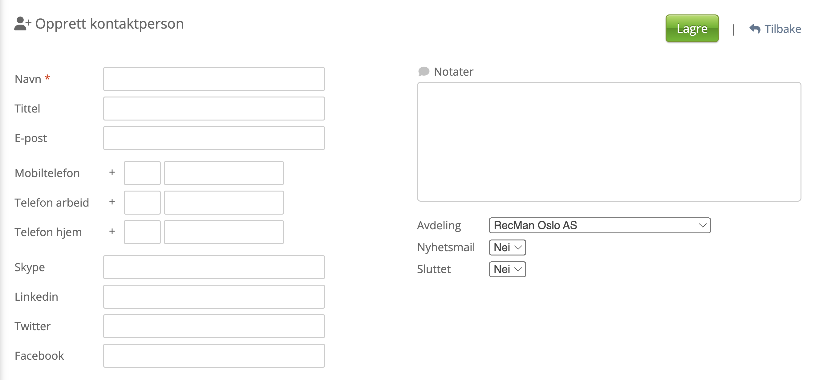 • Avdeling: Koble kontakten til en avdeling i RecMan, som standard er den satt til brukerens avdeling, men kan endres