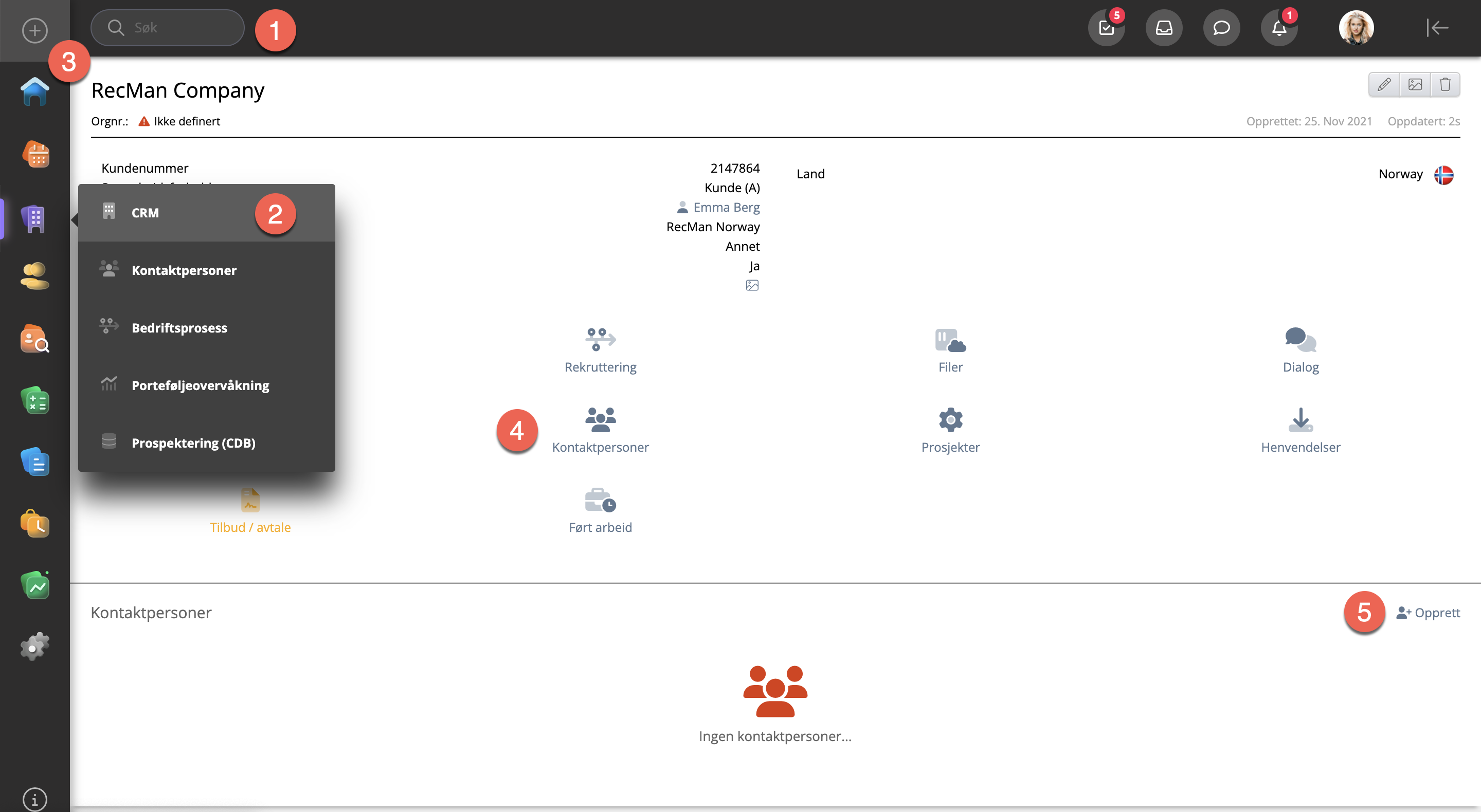 Legge til en kontaktperson kan gjøres fra bedriftskortet. Gå til et firmakort ved enten å søke i søkefeltet (1), slå opp et firma fra CRM-databasen (2), eller ved å opprette en ny bedrift i RecMan (3).