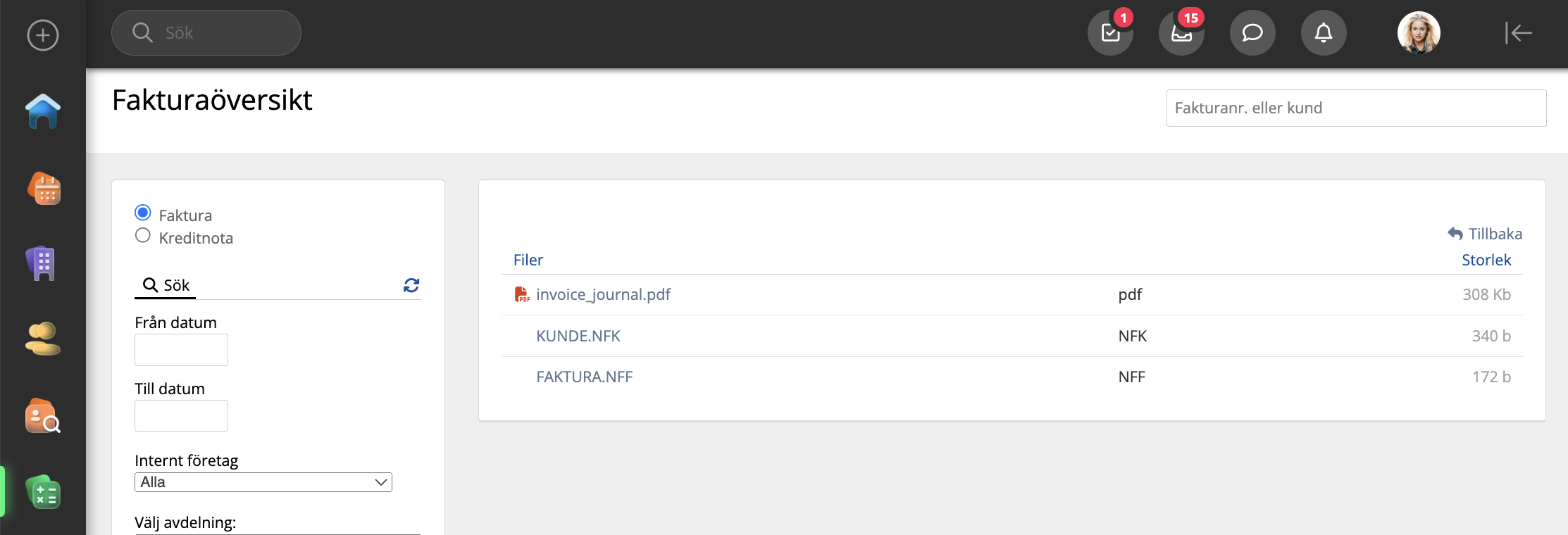 Eksporten for Nordea Finance Factoring gir deg 3 filer som du kan generere fra fakturamodulen. Eksporten vil generere en fakturajournal, en fil for kundedata (Kunde.NFK) og en fil for fakturaer og kreditnotaer (Faktura.NFF). Alle 3 kan lastes ned fra fakturamodulen.