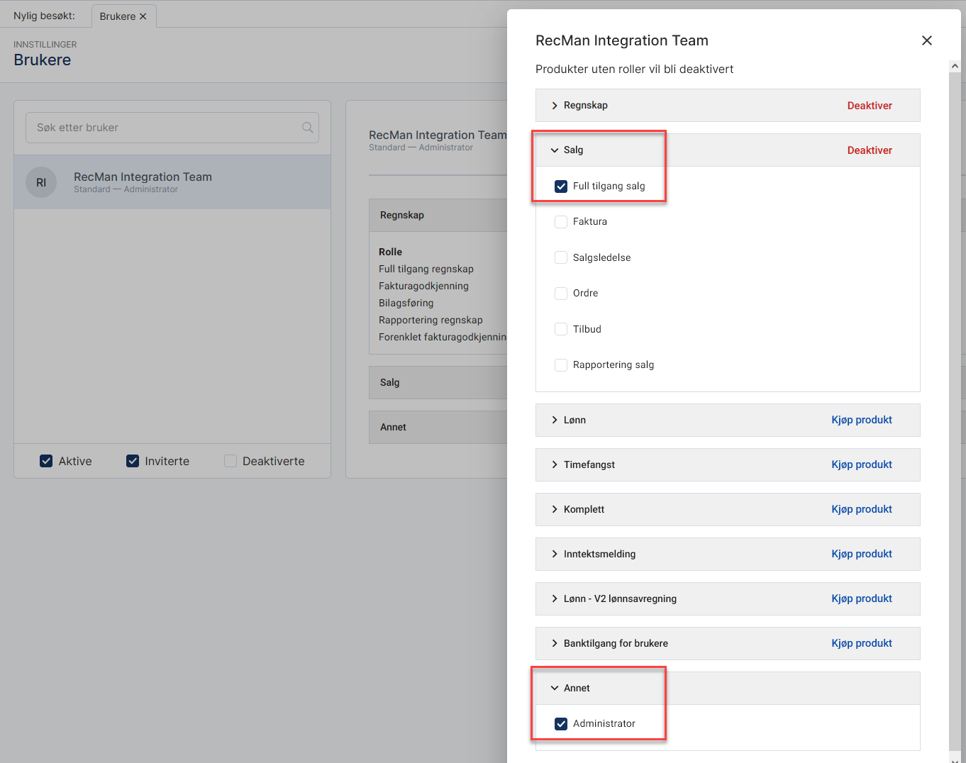 Brukeren som aktiverer integrasjonen må ha rollene "Administrator" og "Full tilgang salg."