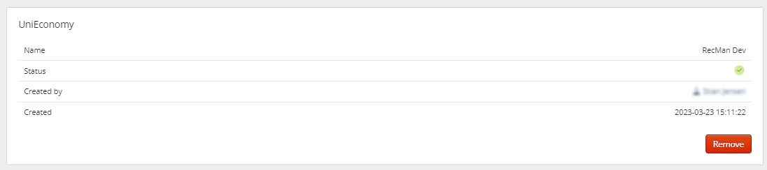 Trykk RecMan og Fortsett for å koble RecMan med UniEconomy. Deretter blir du returnert til RecMan, og du bør se at tilkoblingen er aktivert slik: