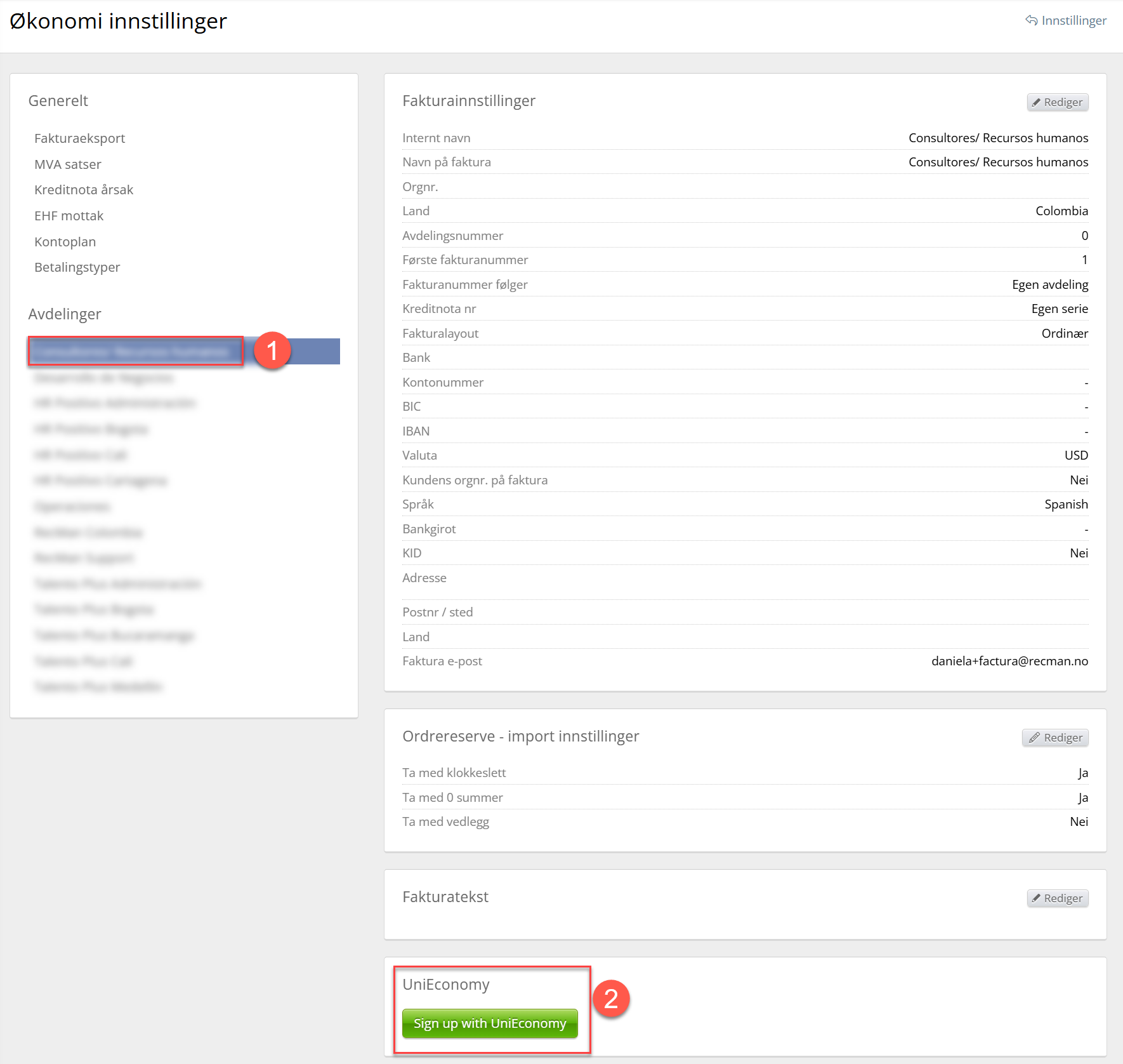 Når UniEconomy er aktivert som en fakturaeksport trykker du på avdelingen du ønsker å koble til UniEconomy og deretter på Registrer deg med UniEconomy.