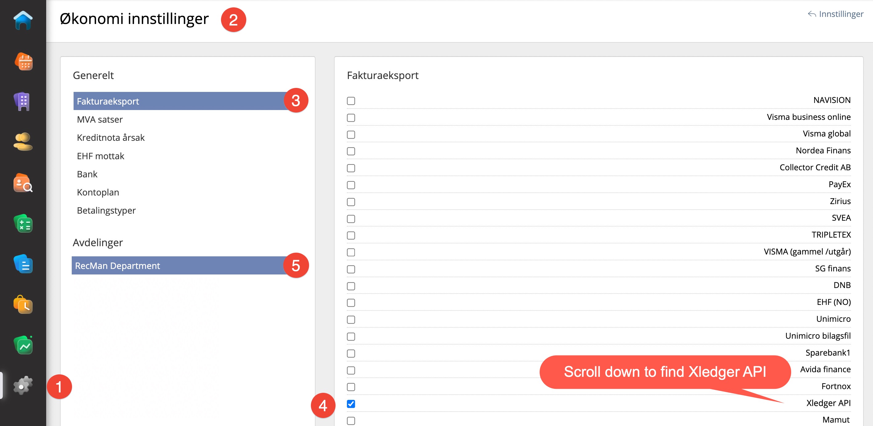 Aktiver Xledger API integrasjonen og legg til API-nøkkel i RecMan