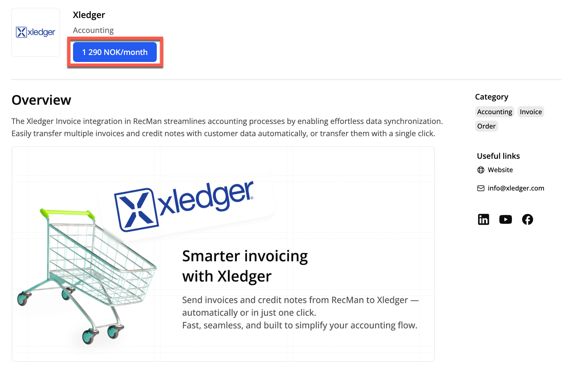 Klikk på den blå aktiveringsknappen med prisen for å begynne å bruke Xledger-integrasjonen.