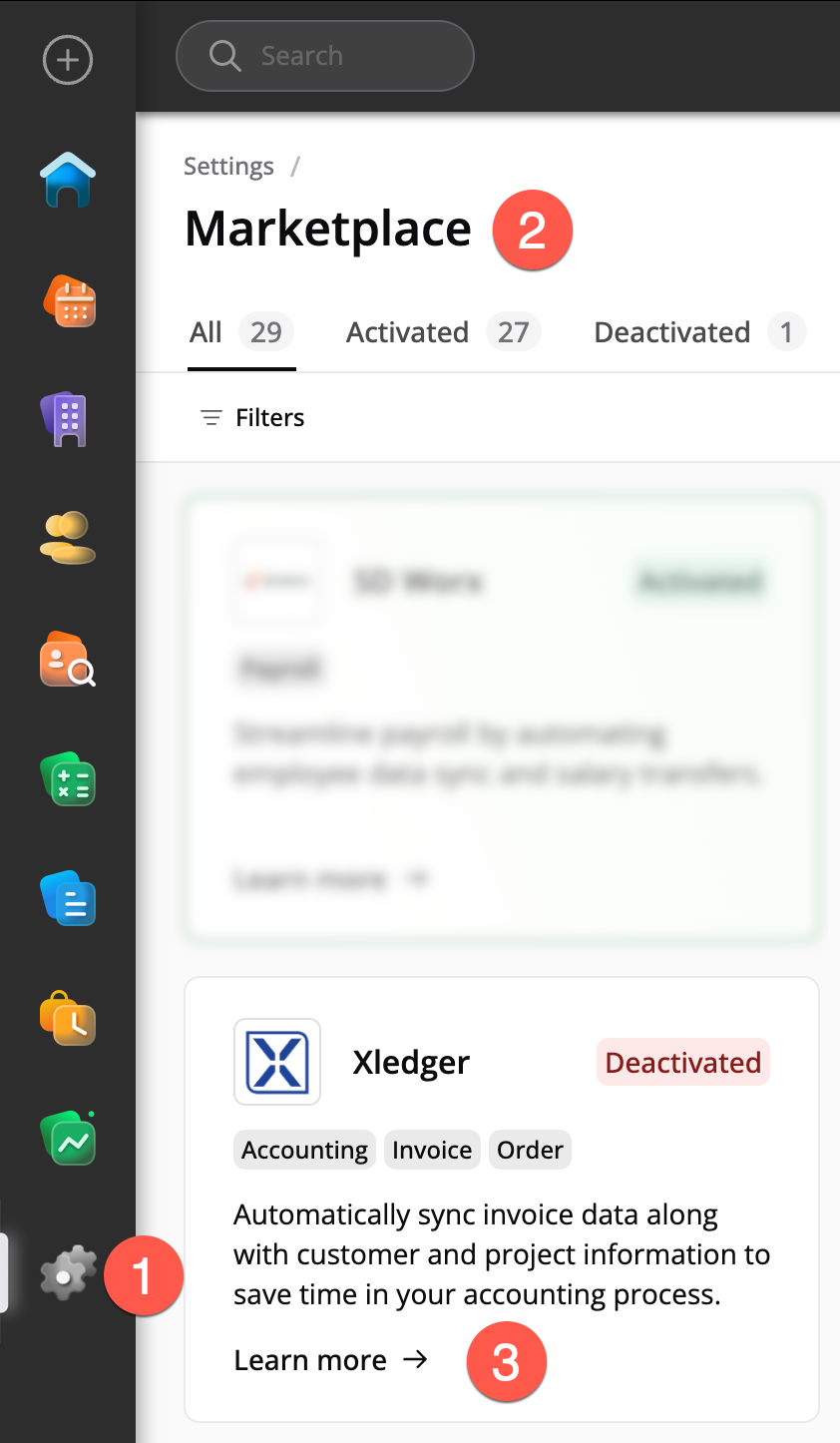For å aktivere Xledger-integrasjon, gå til Systeminnstillinger og velg Markedsplass.