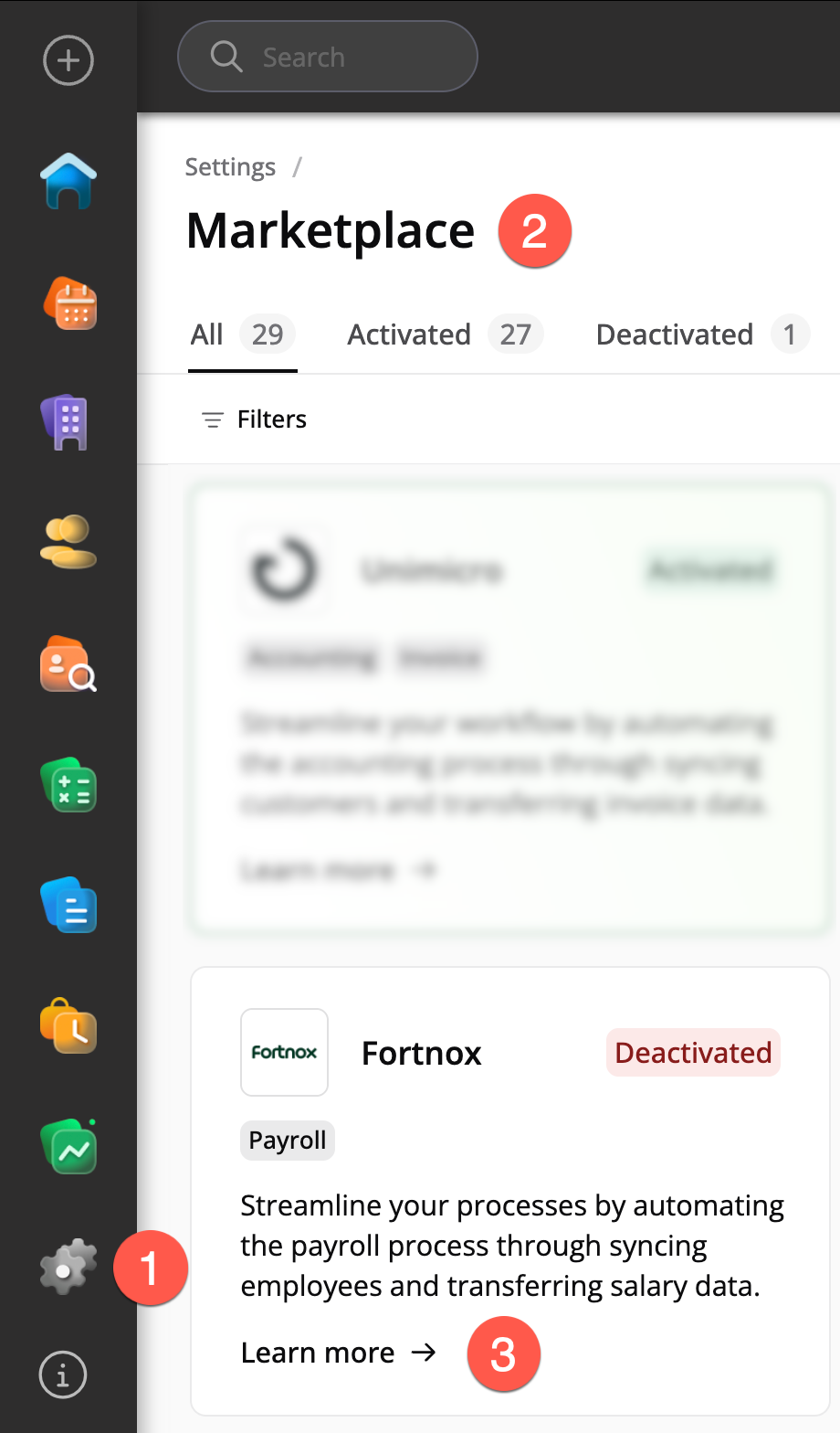 For å aktivere Fortnox integrasjonen, gå til Systeminnstillinger og velg Marketplace.