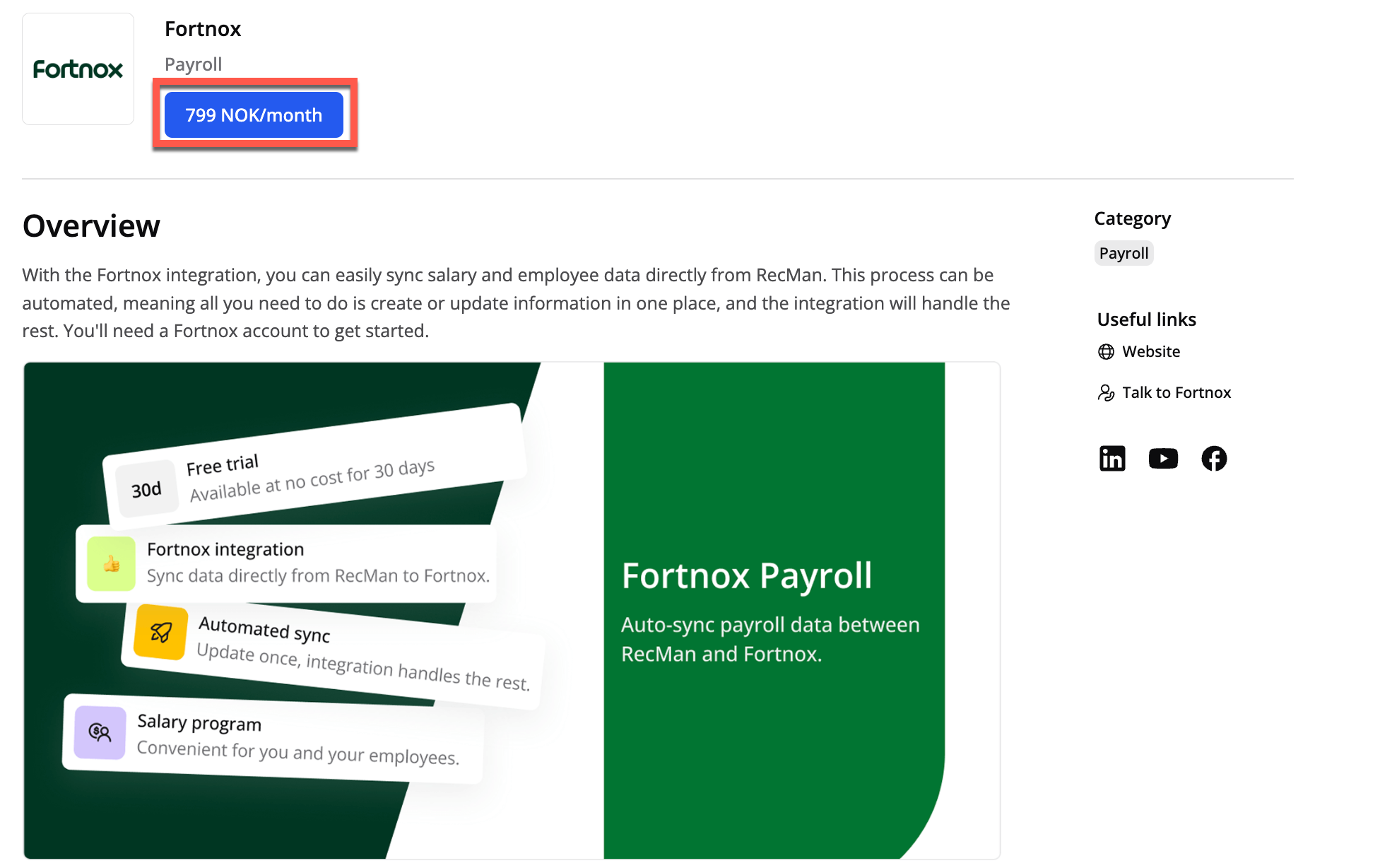 Klikk på den blå aktiveringsknappen med prisen for å begynne å bruke Fortnox integrasjonen.