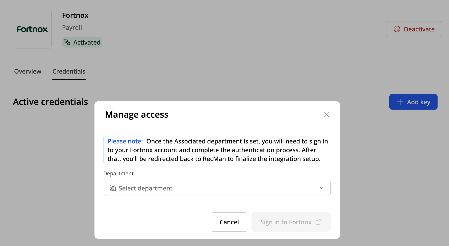 Du vil bli videresendt til Fortnox nettsiden for å logge inn, velge organisasjonen din, gjennomgå og godta alle nødvendige tillatelser. Når du returnerer til "Manage access"-vinduet, skriv inn Nøkkelnavn som siste steg.