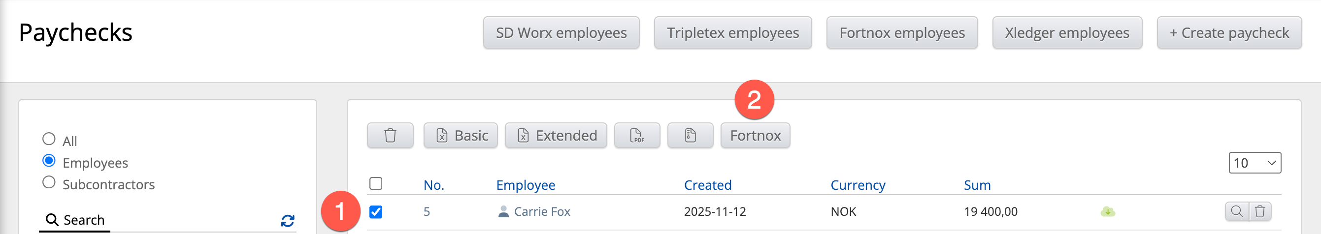For å eksportere til Fortnox, gå til skjermbildet Lønnsgrunnlag, marker én eller flere artikler, og trykk på Fortnox-knappen som vises øverst. Når du gjør dette, overføres timeregistreringer, artikler og ansatte automatisk til Fortnox.