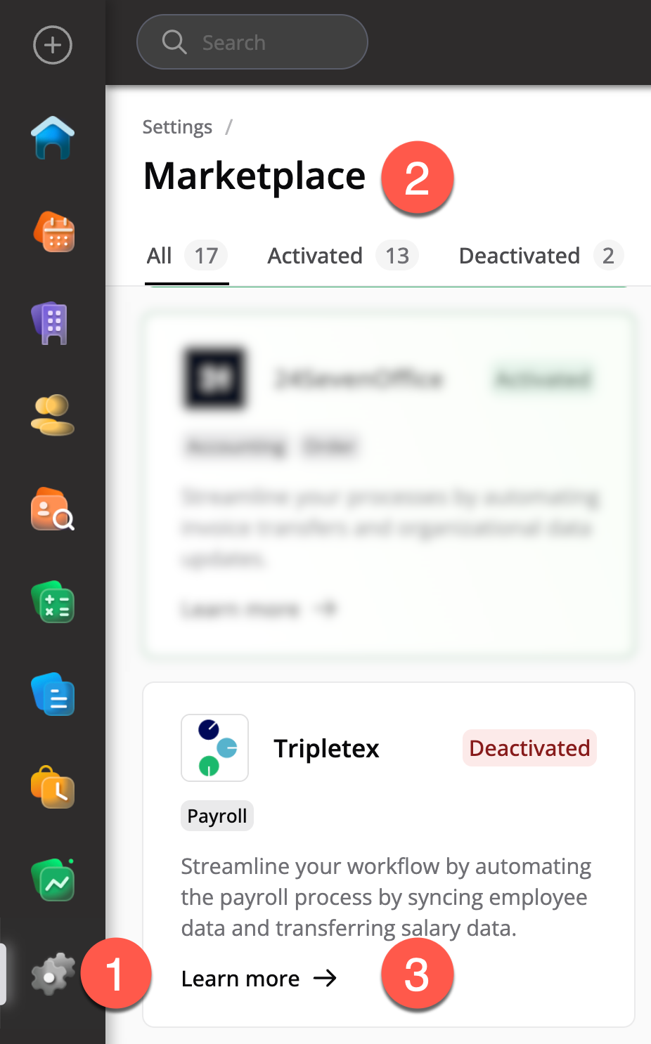 For å aktivere Tripletex Lønn-integrasjon, gå til Systeminnstillinger og velg Marketplace.