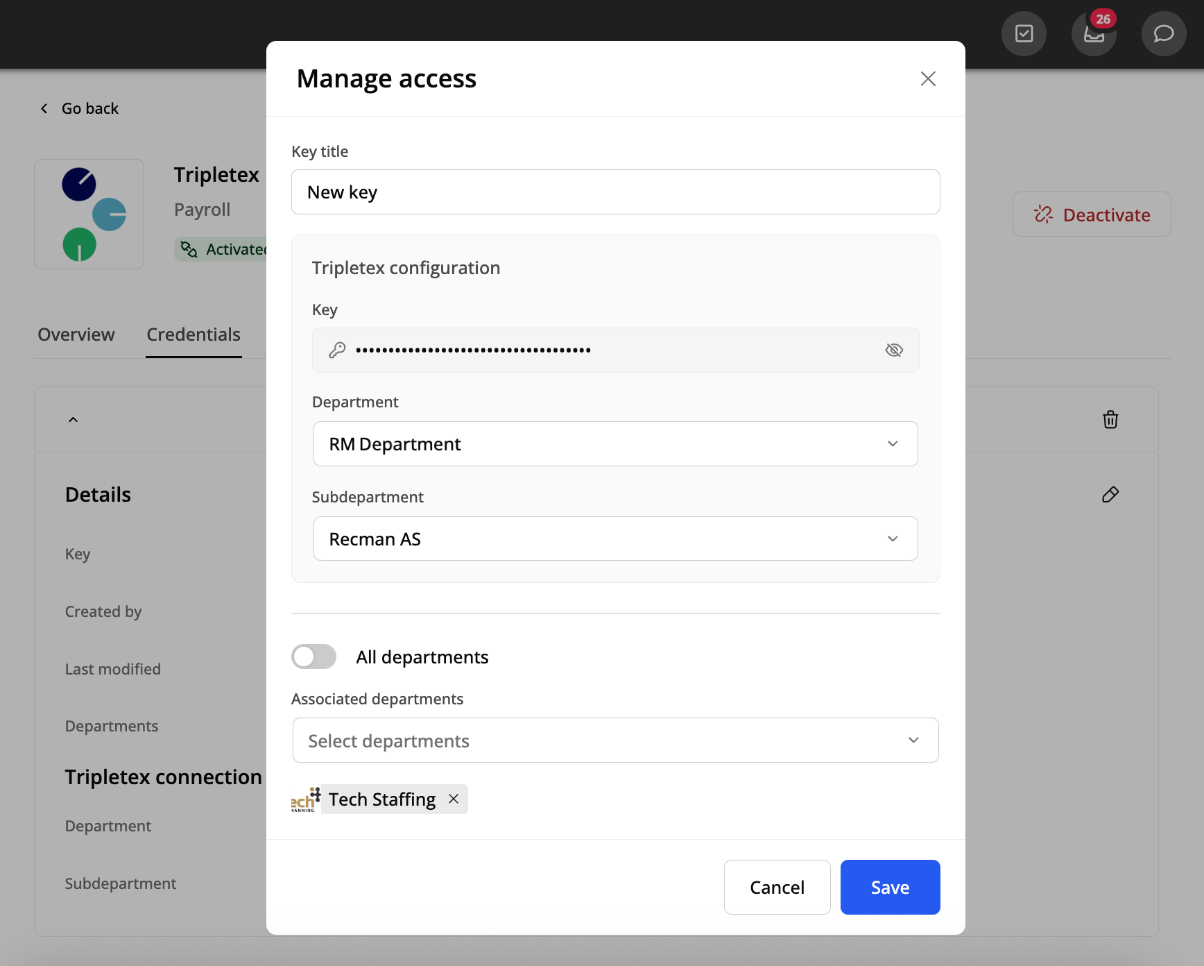 Deretter velger du Tripletex-avdeling og underavdeling og velger om API-nøkkelen skal være tilgjengelig for: