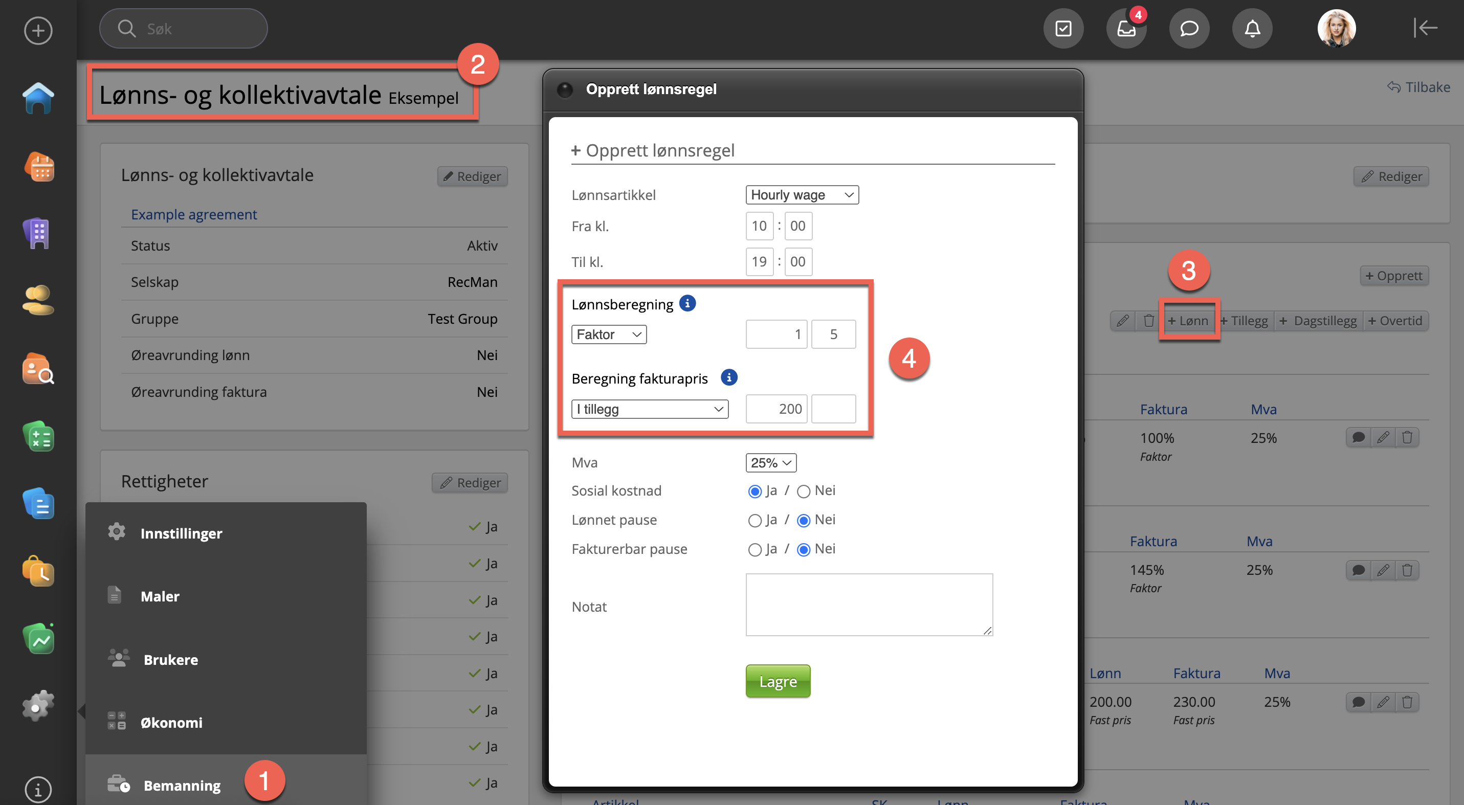 I kollektivavtalen kan du definere regler for hvordan lønn og faktura kalkuleres.