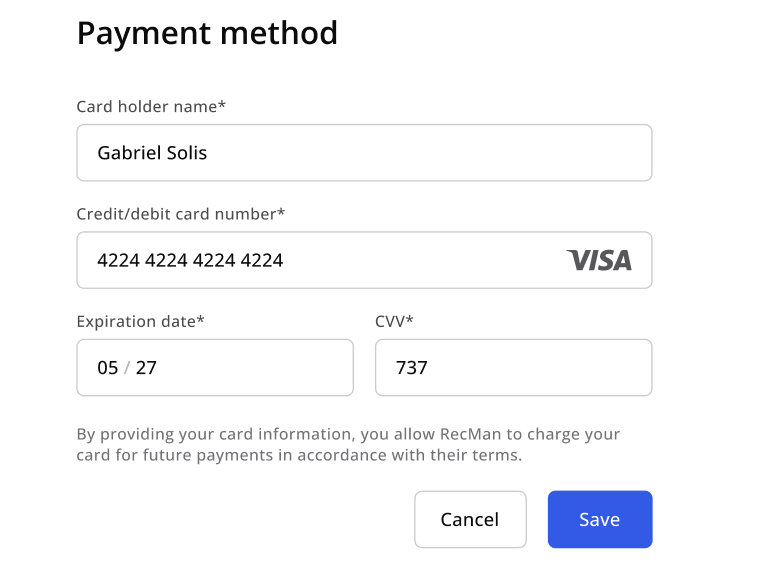 Denne artikkelen beskriver faktureringsflyten som tillater tillegg av betalingskort til RecMan for å forenkle fakturabetaling.