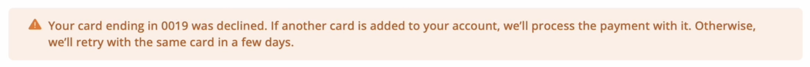 Betalinger behandles sikkert via vår integrasjon med Stripe. Hvis en betaling fra primærkortet mislykkes, vil vi bruke et alternativt kort hvis tilgjengelig, om dette ikke går vil vi vennligst informere deg om transaksjonsproblemene med en detaljerte meldinger. Hvis bare ett kort legges til, vil betalingen prøves på nytt om noen dager med det samme primærkortet. I tilfelle problemet er løst og transaksjonen er vellykket, vil varselet forsvinne.