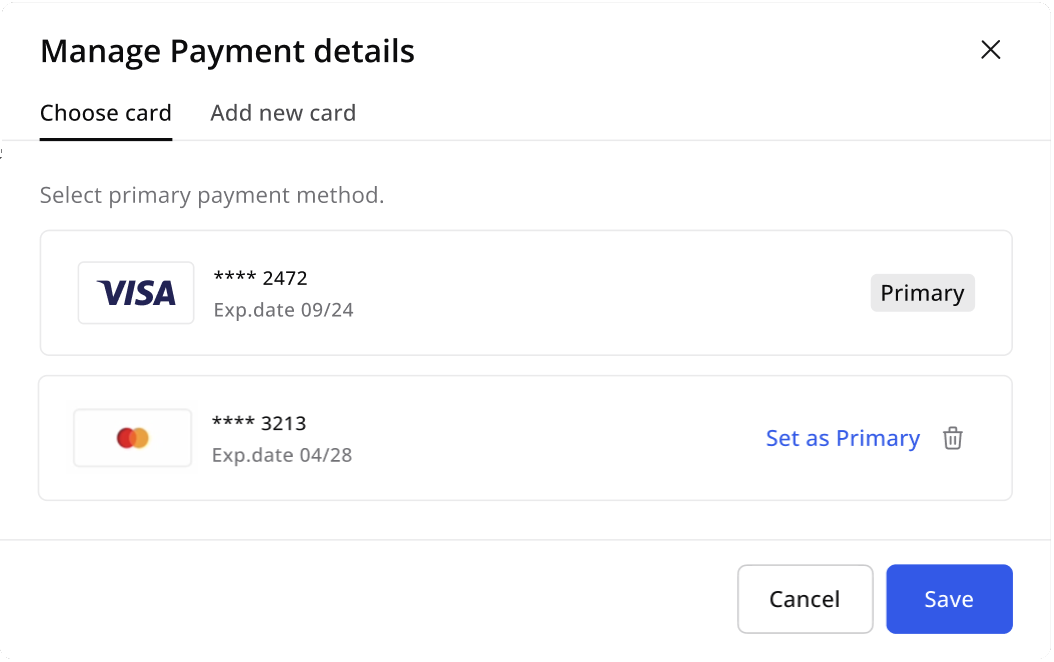 Det første kortet som legges til vil bli satt som en Primær (standard) betalingsmåte. Du kan også legge til andre kort og spesifisere hvilket du skal bruke som primærkort.