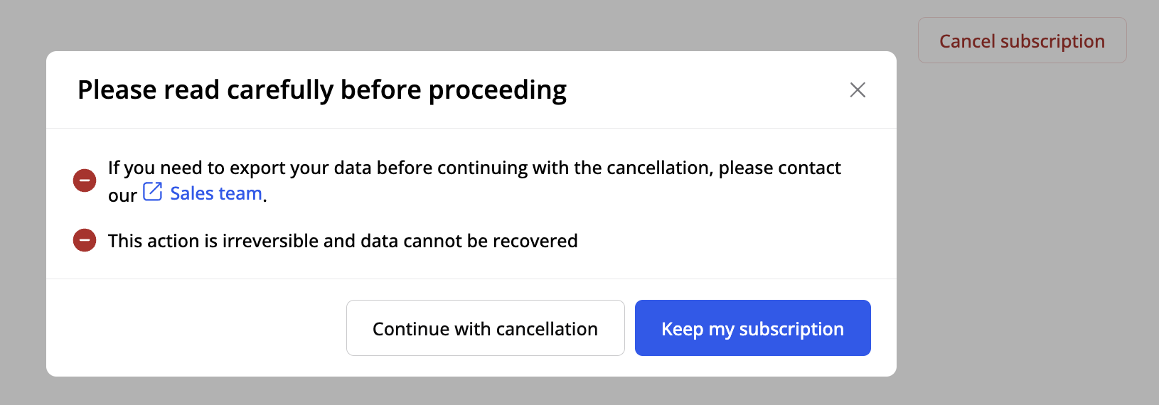 Klikk på Kanseller abonnement knappen for å deaktivere din RecMan konto. Når du bekrefter kanselleringen, vil RecMan systemet bli stengt umiddelbart, og kontoen kan ikke gjenopprettes. Kontakt salgsteamet vårt hvis du trenger å eksportere dataene dine på forhånd.