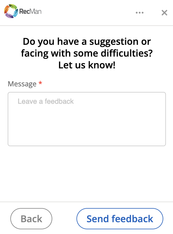 Når du klikker på knappen med tre prikker, kan du gi tilbakemelding, få tilgang til innstillinger eller logge ut. I innstillingene kan du endre språk. Språkvalg inkluderer engelsk, tysk, norsk, svensk, spansk og dansk. Nye brukere vil automatisk se utvidelsens lokaliseringsspråk basert på språket satt i profilen deres i RecMan-systemet ved første innlogging, mens alle brukere kan bytte språk via utvidelsens innstillinger.