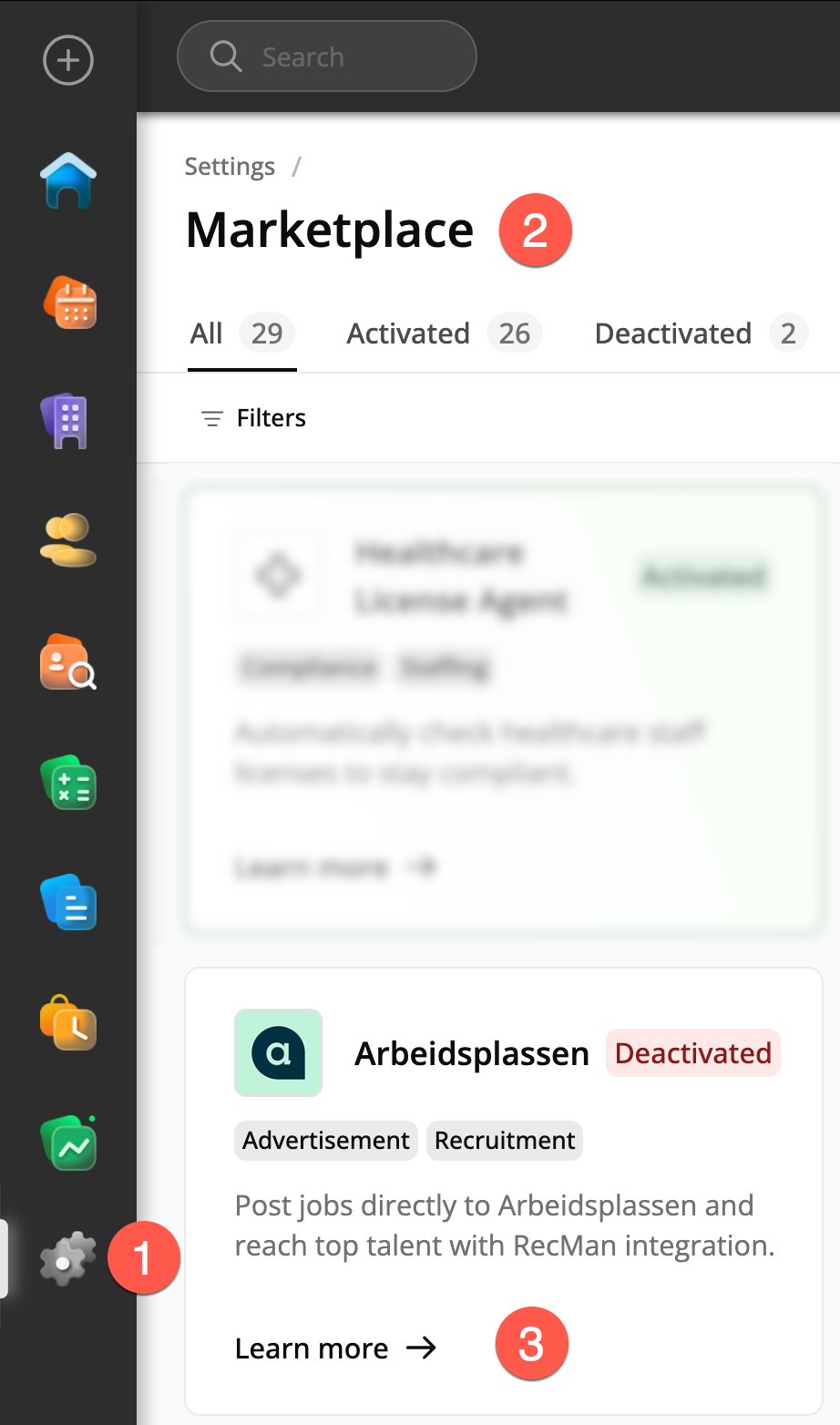 For å aktivere Arbeidsplassen integrasjonen, gå til Systeminnstillinger og velg Marketplace.